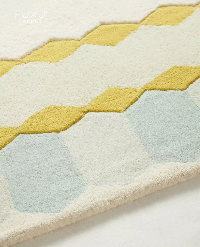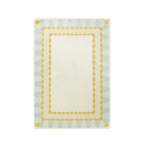 Лимонные оттенки придают ковру жизнерадостность и свет. Они напоминают о ярких солнечных днях и приносят ощущение свежести и энергии. Голубые тона, в свою очередь, успокаивают и умиротворяют, вызывая ассоциации с безоблачным небом и спокойной водной гладью. Эти два цвета искусно переплетаются в орнаменте ковра, создавая уникальный и гармоничный узор.