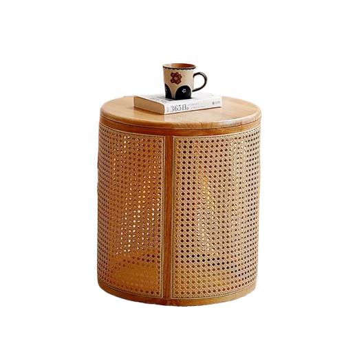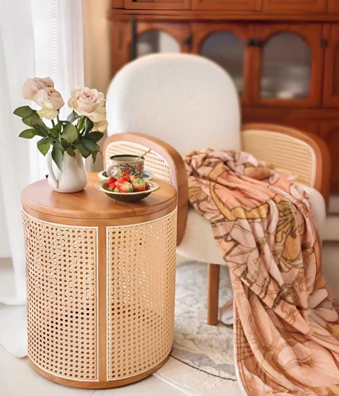 Представьте себе столик, излучающий тепло и уют. Его цилиндрическая форма плавно перетекает в основание, опоясанное искусной вязью ротанга. Ротанг, словно солнечное кружево, обнимает нижнюю часть столика, придавая ему легкость и естественность.