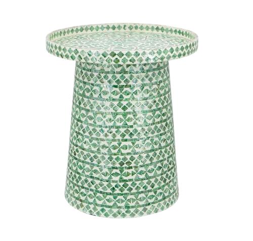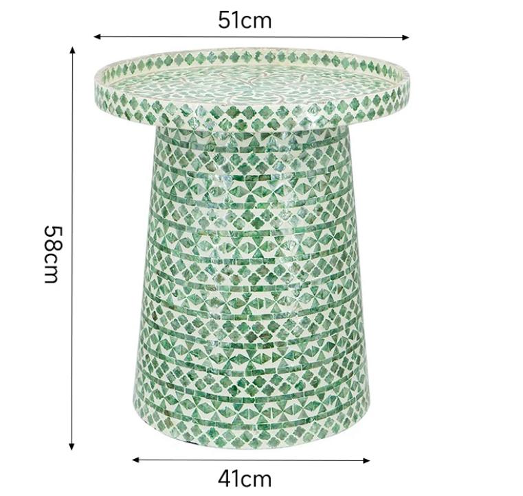 Гладкая поверхность стола удивительно декорирована орнаментом, созданным из перламутра морской раковины. Сияние переливающихся оттенков бирюзового и голубого и зеленого завораживает, словно волны морской глади. Каждый орнамент – это уникальное произведение искусства, которое придает столику неповторимость и роскошь.