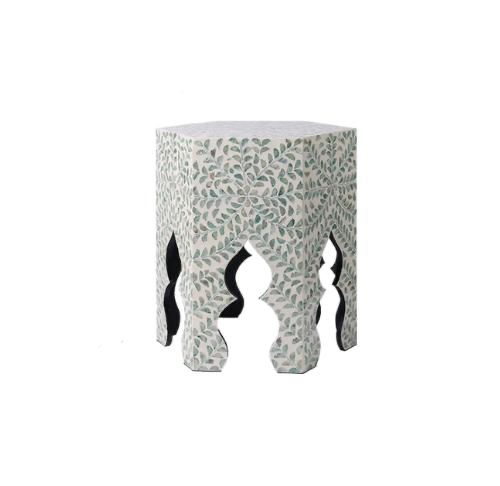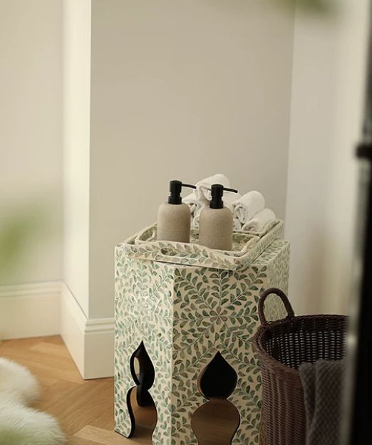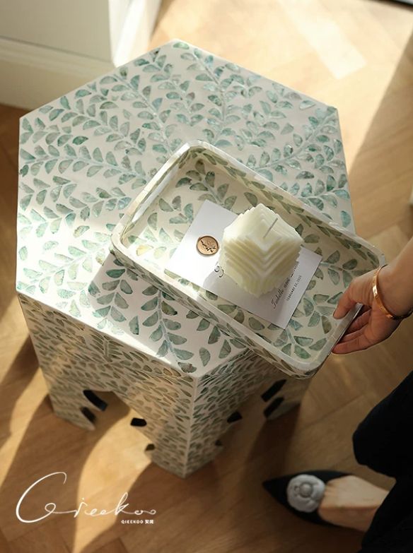 А поверх белого, словно нежные мазки акварели, рассыпаны узоры из нежно-зеленых листиков. Они кажутся живыми, словно только что сорванными с ветки. Эти маленькие зеленые акценты привносят в образ столика свежесть и весеннее настроение. Листики деликатно обвивают поверхность, создавая впечатление, будто по столику тихонько прошелся ветер, оставив после себя легкий след.