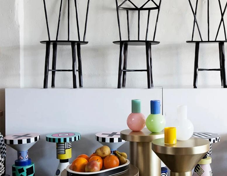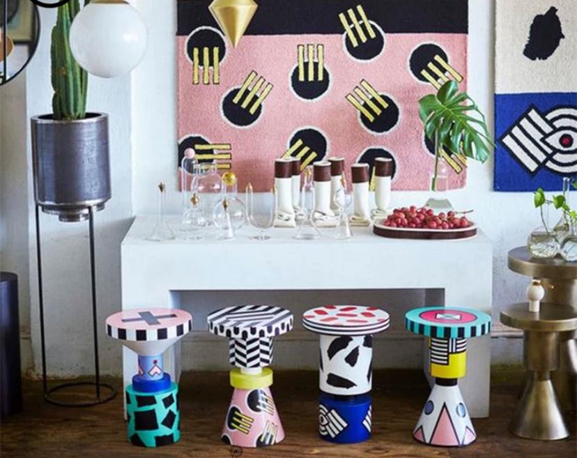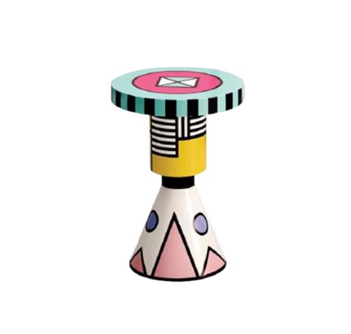 Этот столик не просто мебельный предмет; это яркое полотно, на котором хаотично пересекаются разнообразные геометрические узоры и знаки. Тут можно найти и треугольники, и круги, и квадраты, причудливо перемешанные друг с другом. Каждый элемент имеет свою собственную текстуру и цветовую насыщенность, что усиливает композиционное разнообразие.