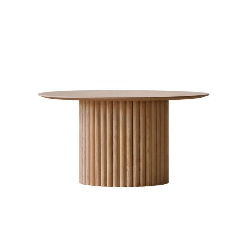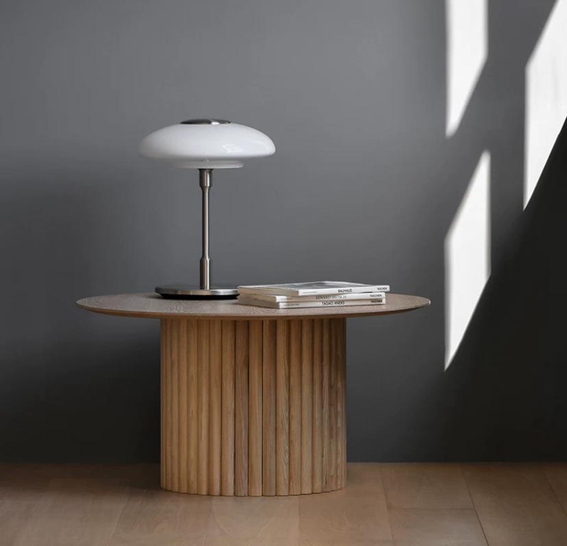 Основой этого изысканного столика служит цилиндрический постамент. Здесь мастерство дизайнеров проявляется особенно ярко — построение цилиндра представляет собой вызов в столярном деле, однако в этом случае он решен с особой элегантностью. Постамент покрыт тонкими деревянными рейками из ясеня, которые аккуратно и равномерно располагаются по всей его поверхности. Такая отделка не только придает столу визуальную легкость и воздушность, но и создает эффект ритмичного движения, подчеркивая естественную структуру дерева.
