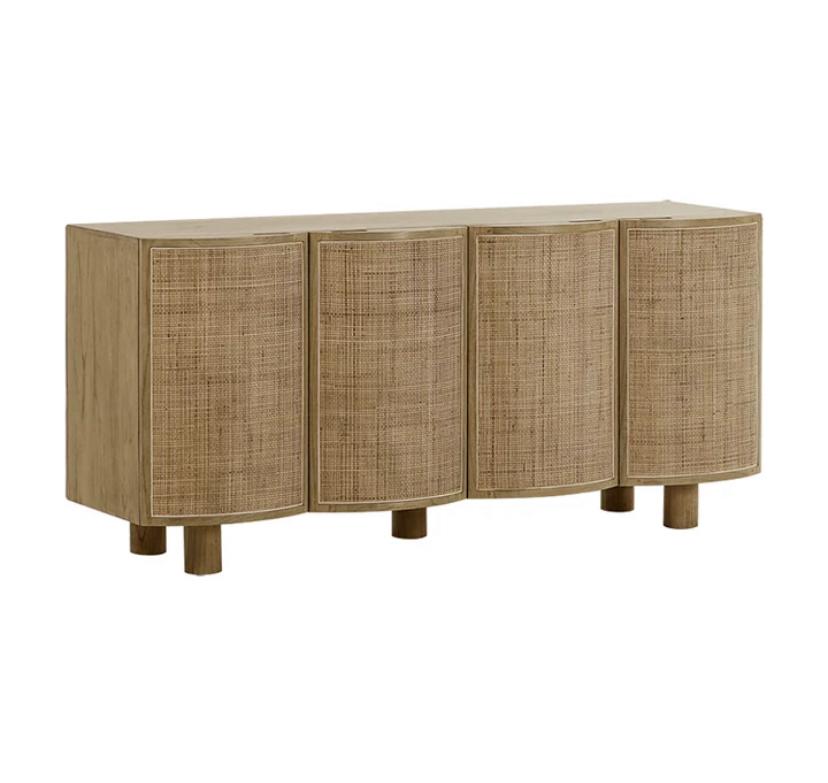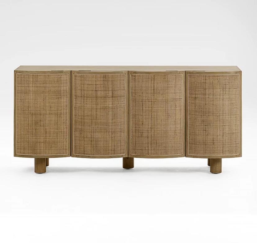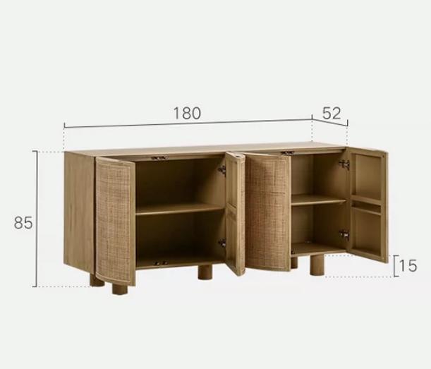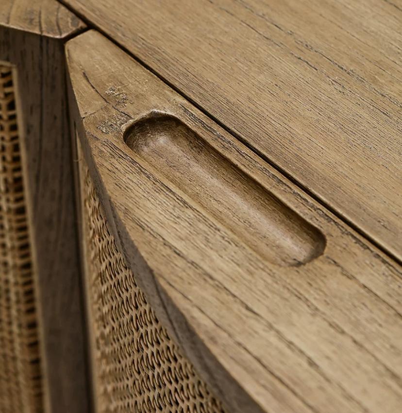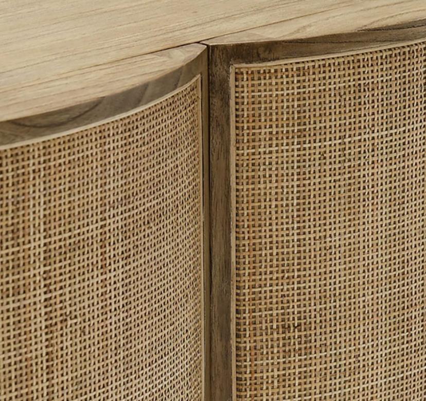Фасады дверок буфета выполнены из плетеного вручную ротанга, что придает ему шарм и особый характер. Плетеная отделка добавляет текстуру и уникальность этому предмету мебели, делая его настоящим произведением искусства.