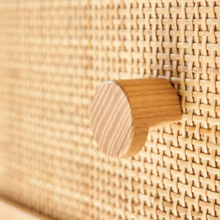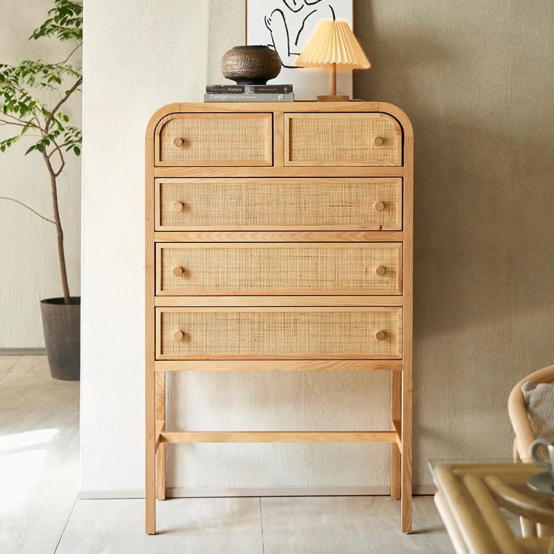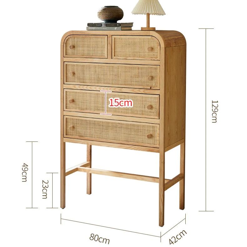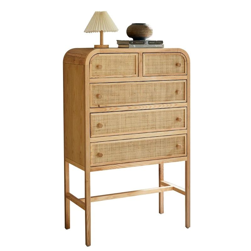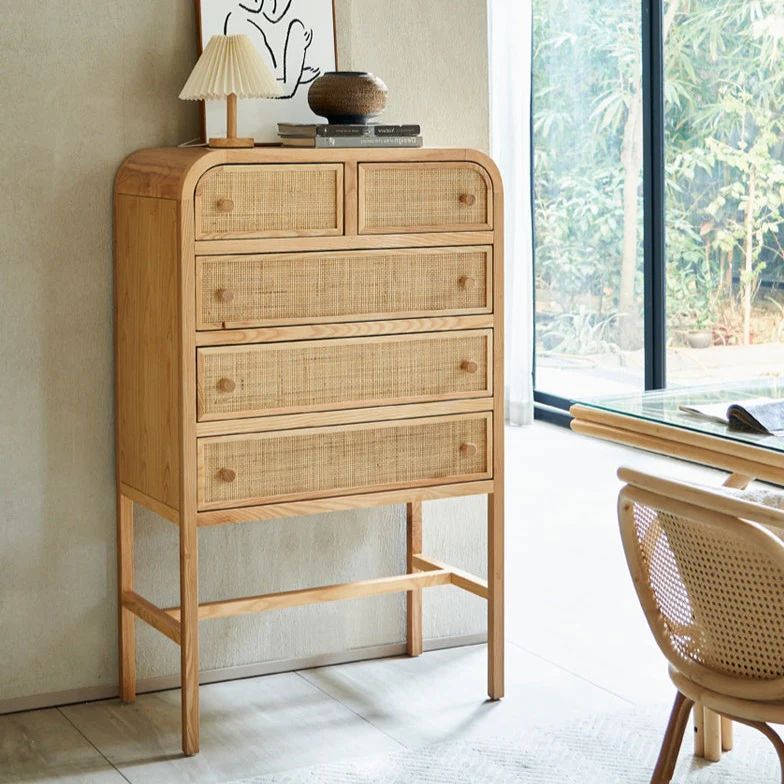 Высокий комод изготовлен из качественного американского ясеня, что придает ему прочность и натуральный вид. Фасад дверок украшен красивым индонезийским ротангом вручную , который добавляет изысканности и природной красоты.