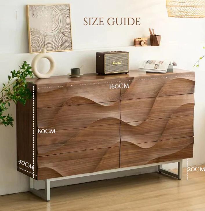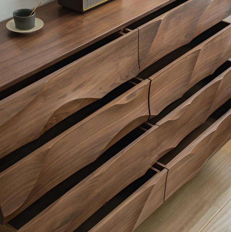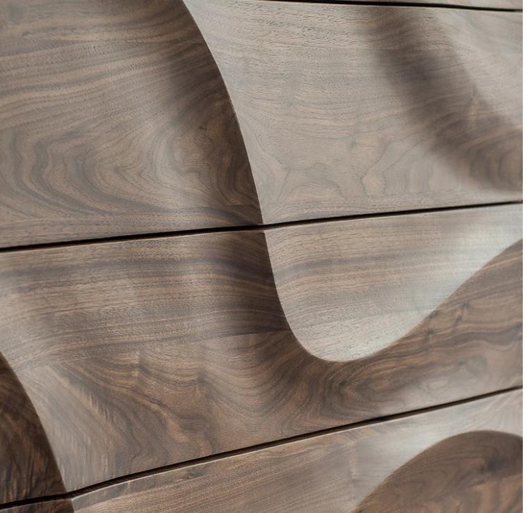 Фасады выдвижных шкафов комода украшены выструганными вручную и отшлифованными волнами 3D, которые создают прекрасный рисунок из натурального ореха. Это добавляет комоду уникальности и оригинальности, привлекая внимание и создавая эффектный визуальный эффект.