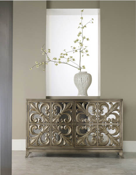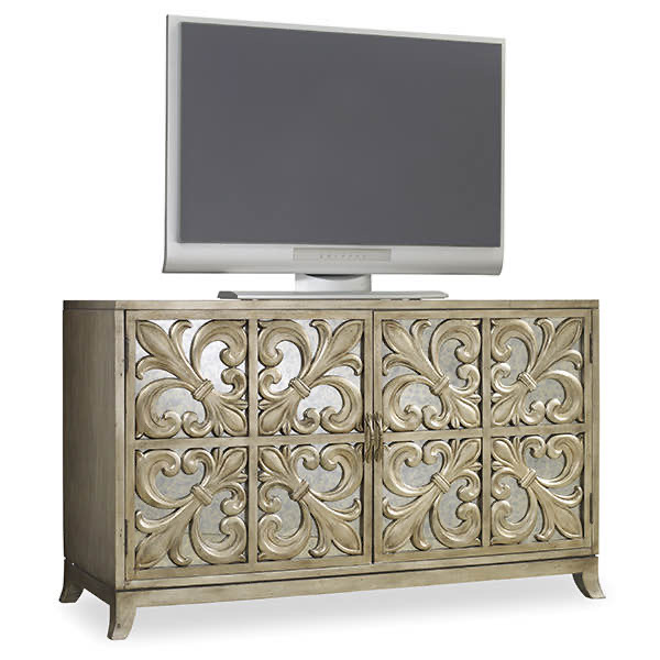 Достаточно лаконичная и современная тумба под ТВ в стиле Арт-Деко. Основательность конструкции придают четкие линии и декор в виде зеркальных дверец.