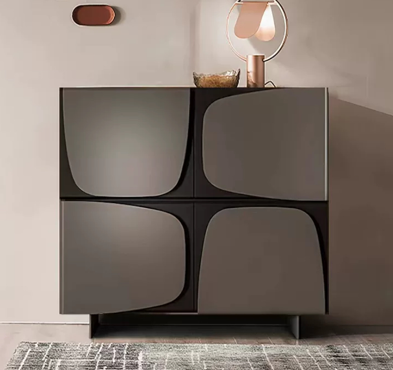 Тумба Camosta — небольшая тумба-буфет темного цвета представляет собой стильное и функциональное мебельное изделие. Она имеет четыре шкафчика, каждый из которых содержит полку. Фасады дверок украшены серо-бежевыми декоративными элементами, которые прекрасно сочетаются с темным основанием.