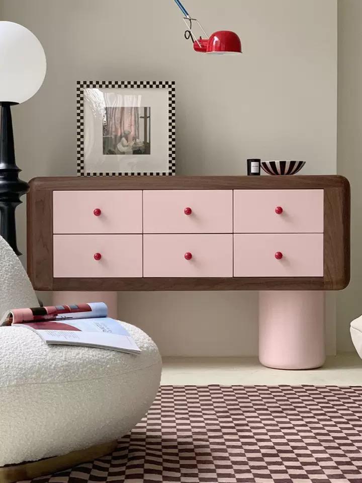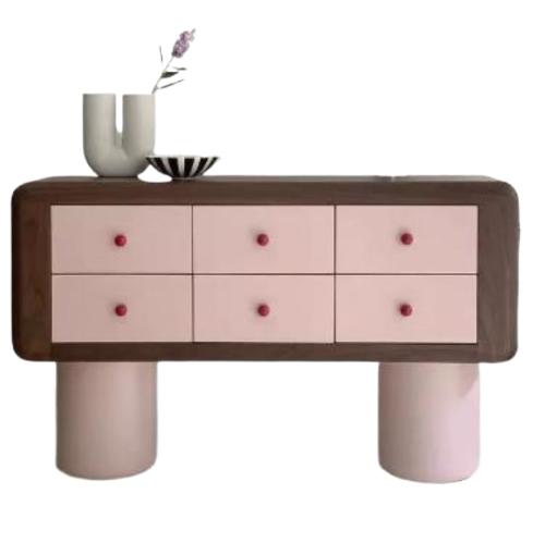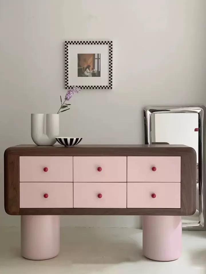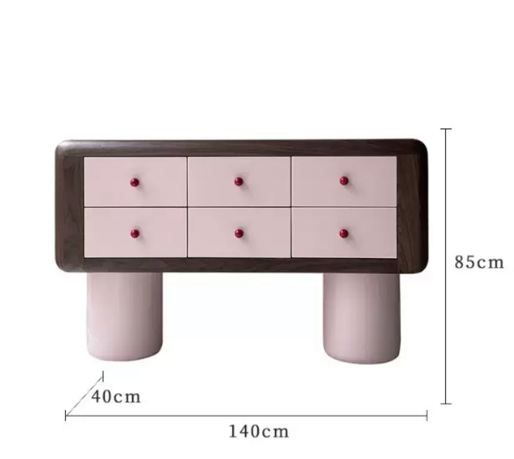 В целом, дизайнерский комод с шестью выдвижными ящиками на двух массивных цилиндрических основаниях, с акцентом на нежно-розовый цвет, является идеальным выбором для тех, кто ищет функциональную и стильную мебель для своего интерьера.