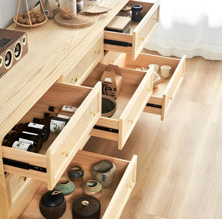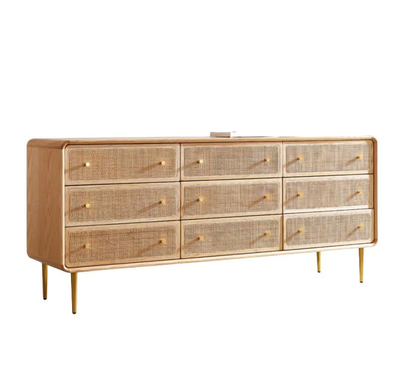 Выдвижные ящички, которые составляют фасады тумбы, декорированы  из прочного и гибкого ротанга. Этот материал добавляет текстуру и создает уютную атмосферу в интерьере. Фасады из ротанга бесподобно сочетаются с ясеневыми элементами, создавая неповторимую игру цветов и фактур.