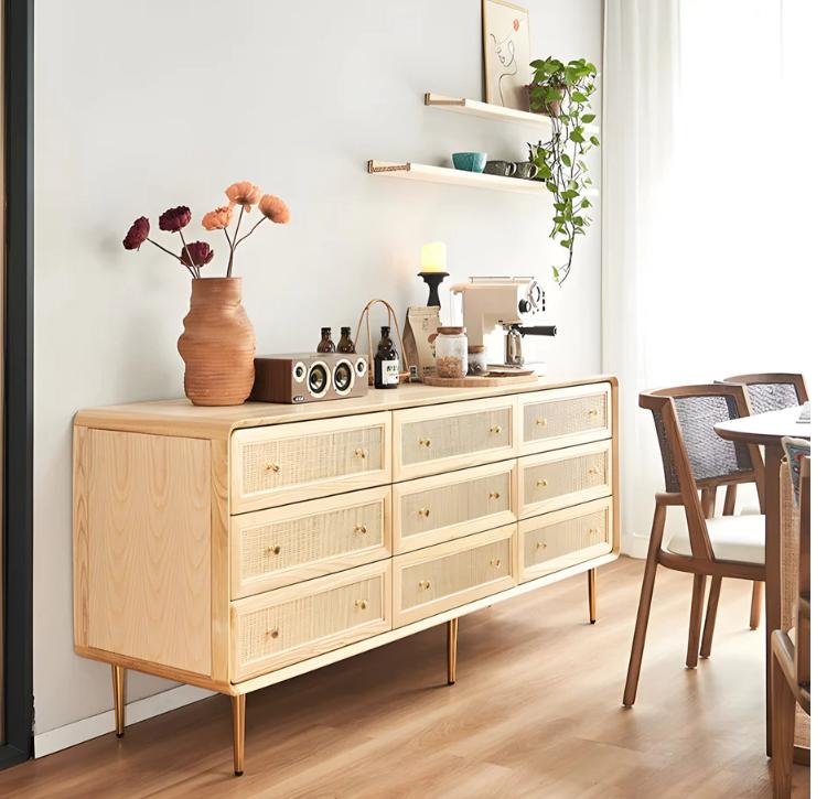 Тумба идеально впишется в скандинавский интерьер благодаря своей светлой отделке и простоте форм. Ясневая отделка придаст помещению натуральность и приятное ощущение пространства, а ротанговые фасады добавят нотку экзотики.