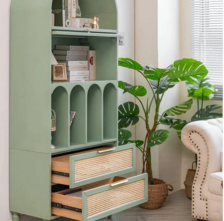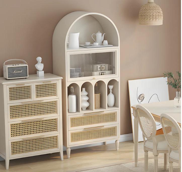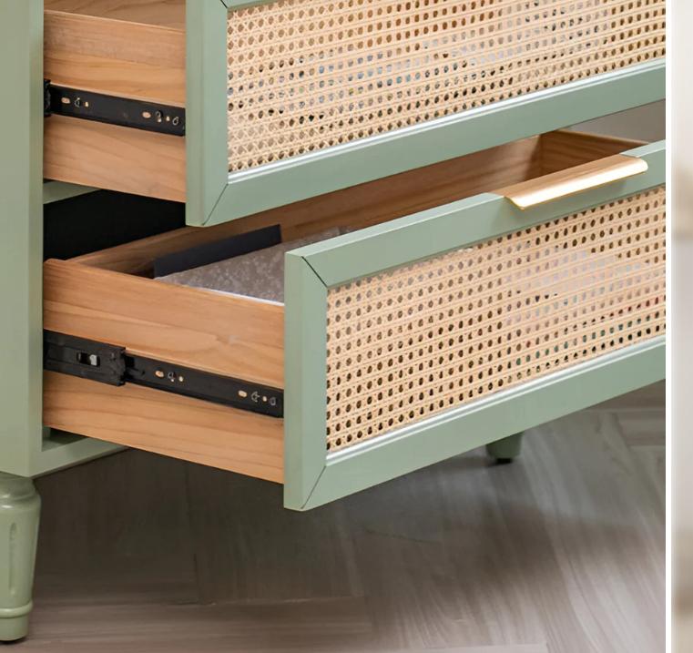Выдвижные ящики шкафа, выполненные из ротанга и украшенные им вручную, придают шкафу неповторимый шарм и создают особую атмосферу провансальского интерьера. Этот элемент декора придает шкафу оригинальность и изысканность, привнося в помещение уют и теплоту.