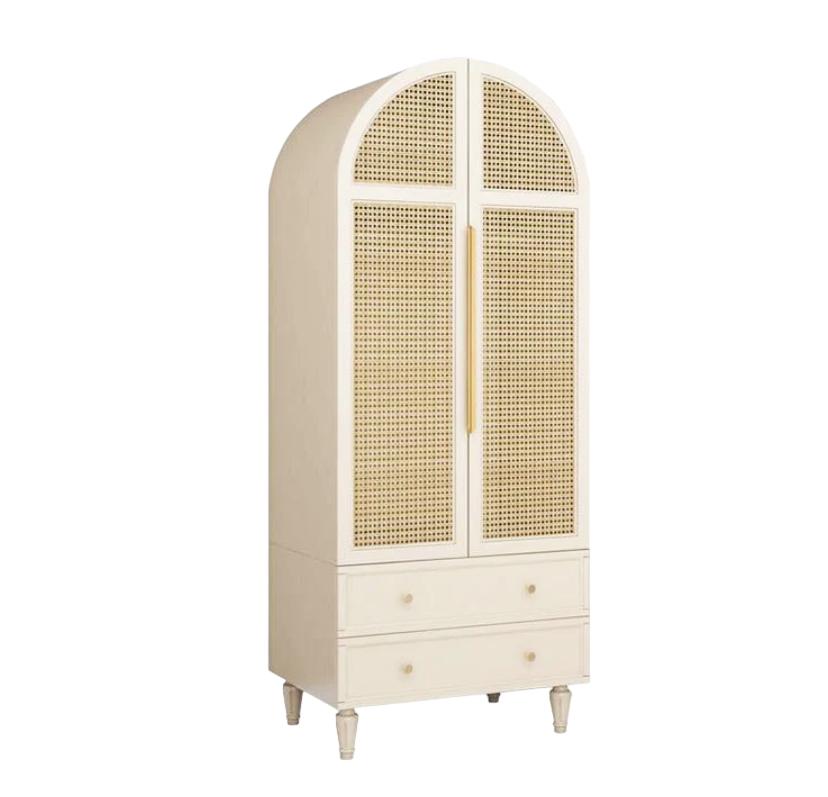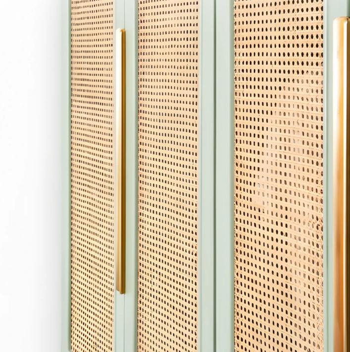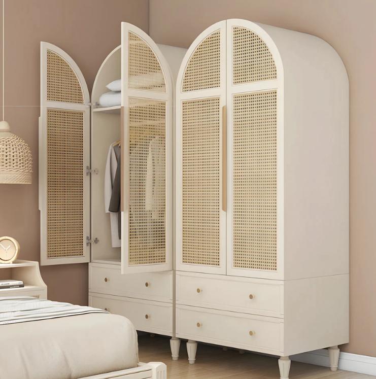 Фасады шкафчиков украшены плетеным ротангом, который придает гардеробу особый шарм и изысканность. Плетение ротанга добавляет текстуры и стройности внешнему виду шкафа, создавая приятное визуальное впечатление.