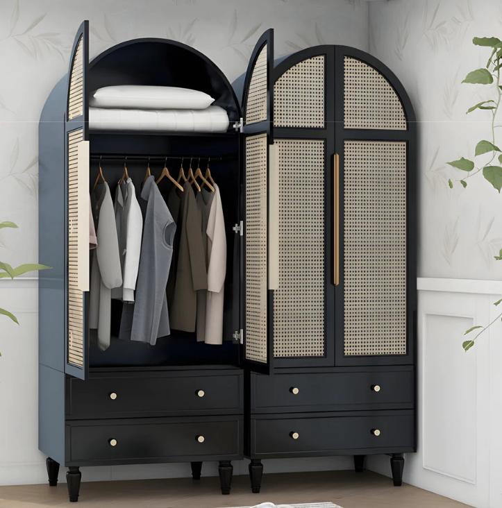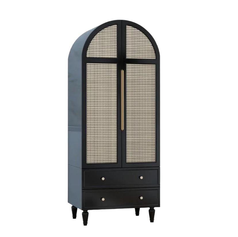 Внутри шкафа вы найдете множество полок, вешалок и ящиков, где вы сможете удобно разместить свою одежду, обувь и аксессуары. Высокий шкаф-гардероб из каучукового дерева с плетеным ротангом на фасадах и вариантами цвета мята, черный и айвори станет не только функциональным элементом вашего интерьера, но и стильным украшением вашего дома.