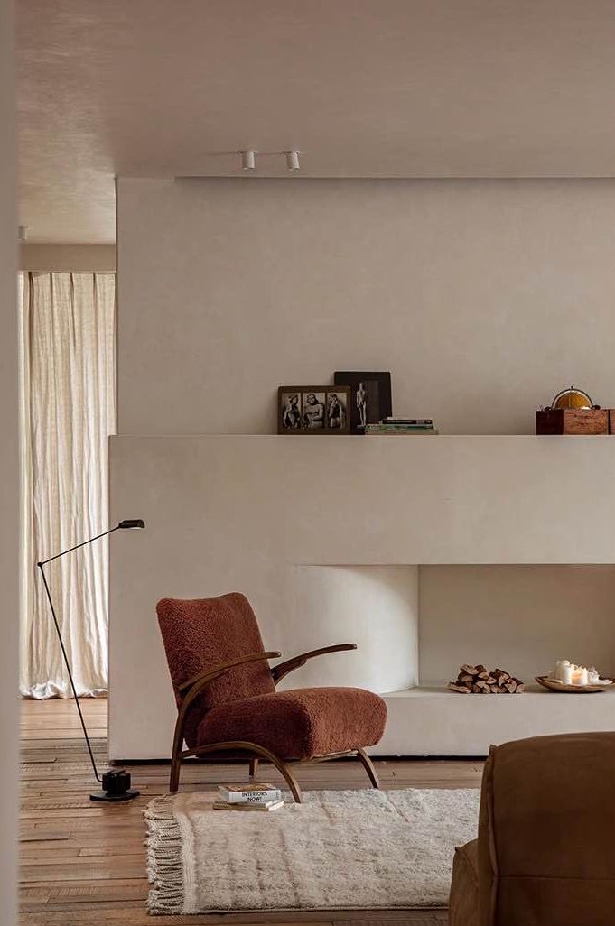 Низкое кресло Bufallo с высокой спинкой и сидением, обтянутыми натуральной тканью из овечьей шерсти, создает комфортную и уютную атмосферу в любом интерьере.