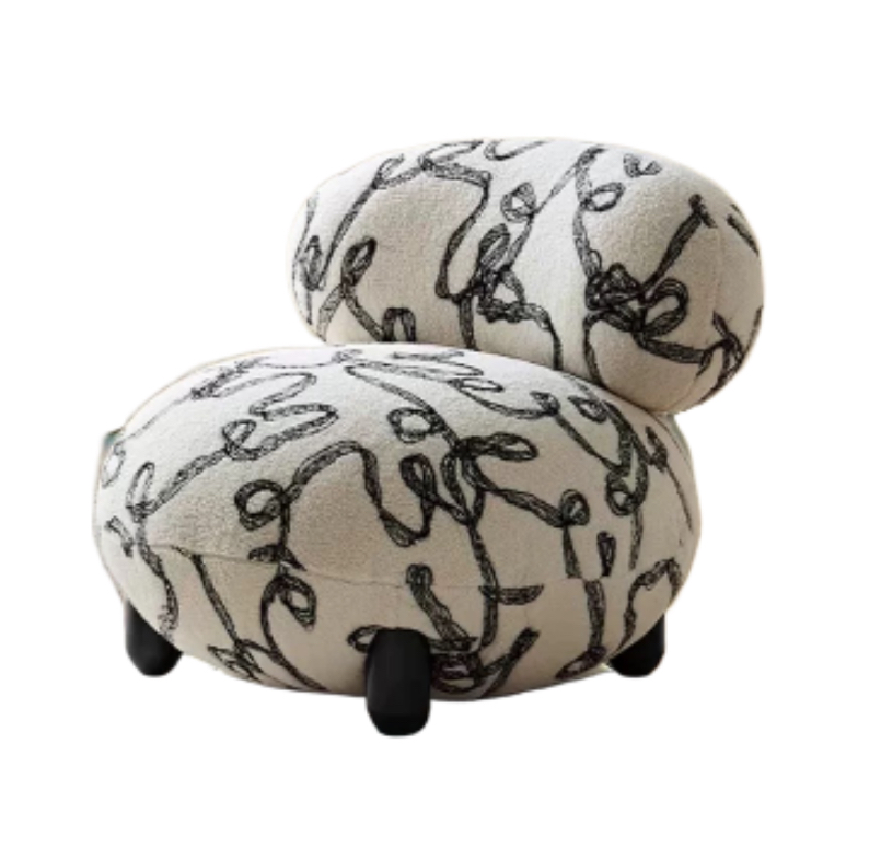 Хаотичные линии на обивке создают впечатление бесконечного движения, что символизирует свободу и креативность. Этот рисунок может ассоциироваться с творческим беспорядком или с потоками энергии, придавая креслу дополнительную глубину и многозначность. Темные линии контрастируют с белым фоном, что делает акцент на уникальности и смелости дизайнерского решения.