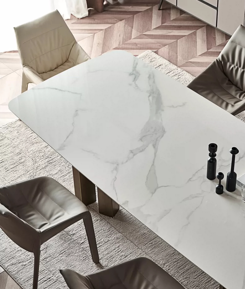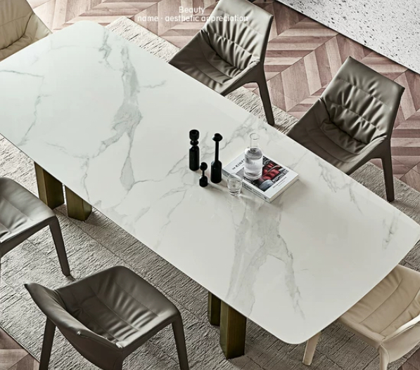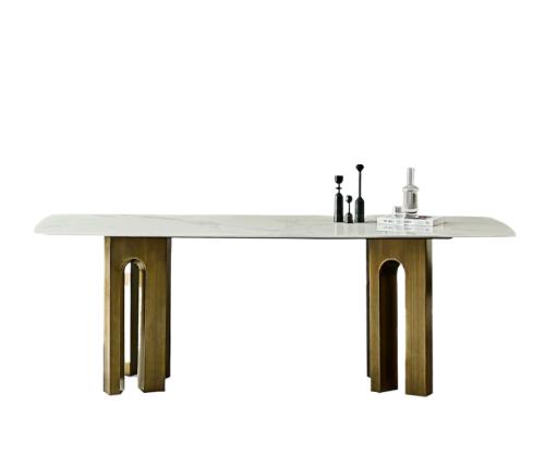 Обеденный стол Reminston, роскошный каменный обеденный стол с дизайнерским металлическим основанием создает впечатление изысканности и роскоши в любом интерьере. Столешница изготовлена из натурального кварца, что придает ей уникальную прочность и долговечность, а также приятно тактильное ощущение при касании.