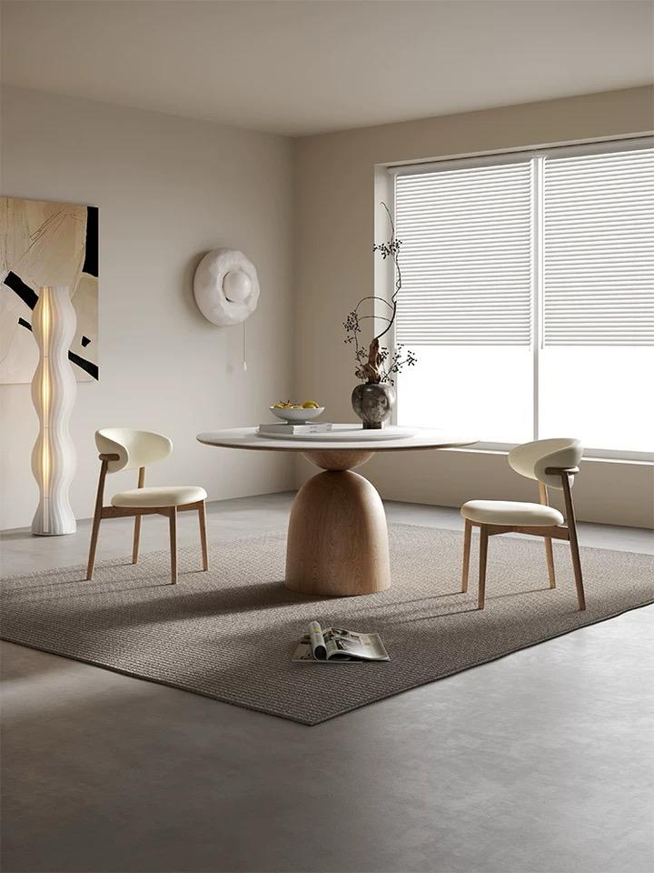 Круглая столешница, изготовленная из натурального кварца, добавляет столу изысканности и эстетического очарования. Кварцовая поверхность выглядит безупречно гладкой и блестящей, подчеркивая простоту и сдержанность минималистического дизайна.
