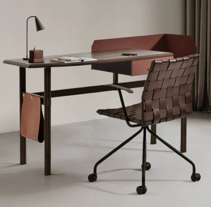 Стол дополняет кожаная папка для бумаг из рыжей кожи. Эта папка не только функциональна для хранения и организации документов, но и придает всему столу элегантность и роскошь. Рыжий цвет кожи создает привлекательный контраст с темным деревом и металлическими элементами.