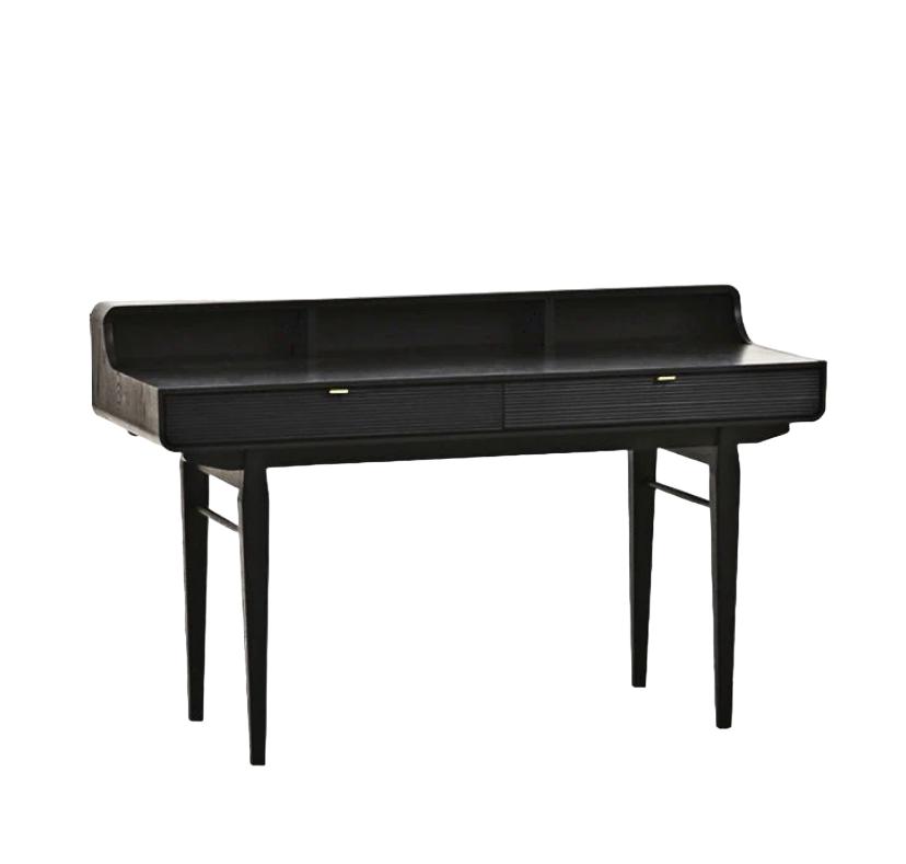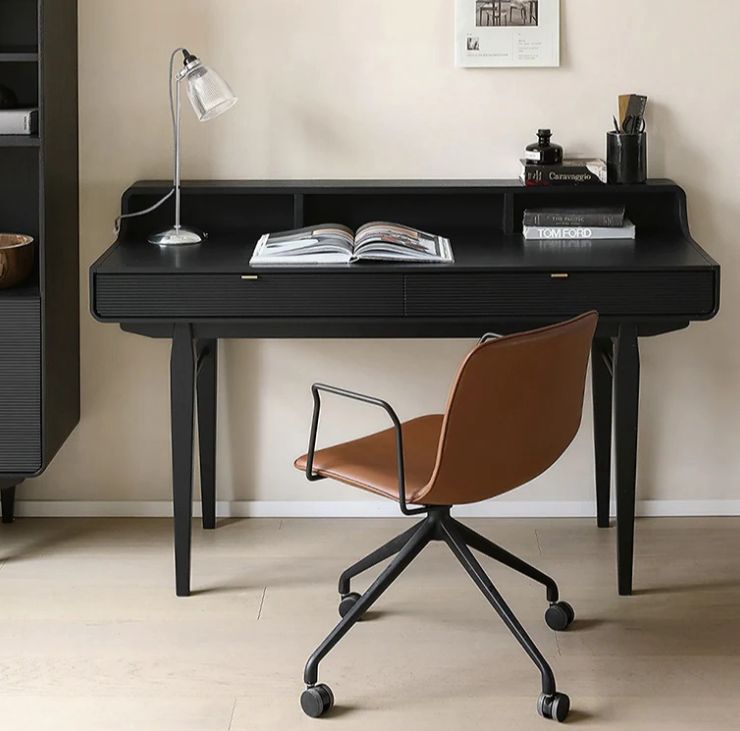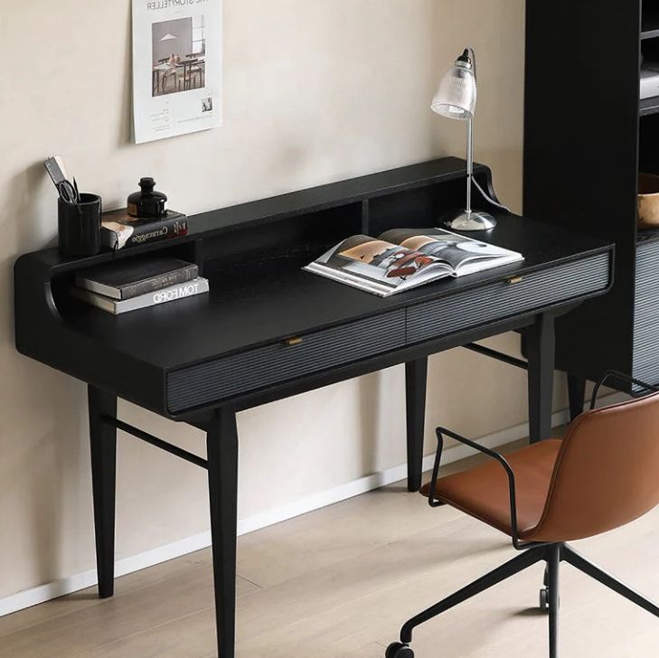 Этот черный рабочий стол в неоклассическом стиле, выполненный из ясеня, с двумя выдвижными ящиками и миниатюрными золотыми ручками, идеально подойдет для офиса или домашнего кабинета. Он сочетает в себе практическую функциональность, эстетичность и роскошь, что делает его прекрасным выбором для тех, кто ценит изысканный стиль и комфорт.