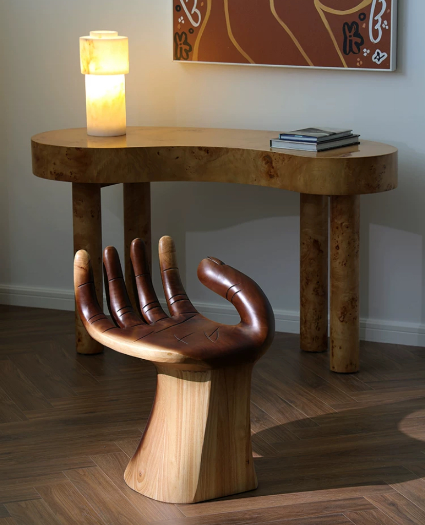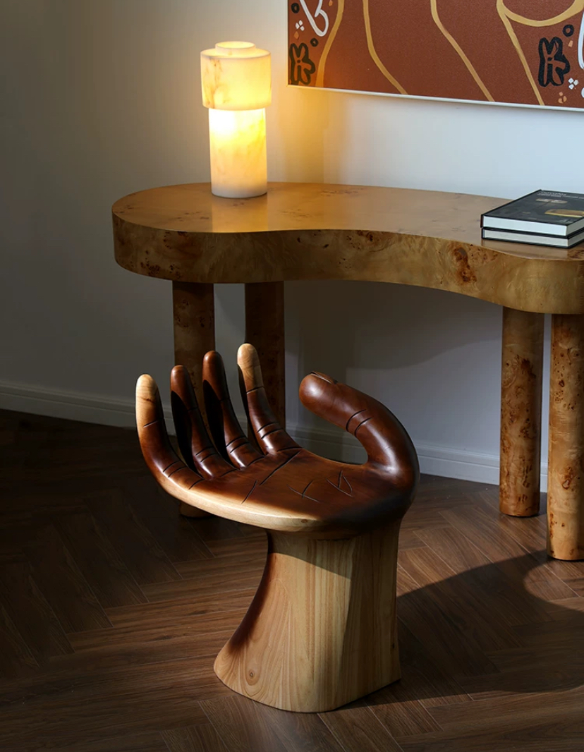 Спинка стула — это искусно вырезанные пальцы, которые не просто поддерживают спину, но и создают ощущение, что вы охвачены теплыми руками. Их толщина и длина позволили мастеру передать сложность и грацию человеческой анатомии. Пальцы аккуратно расходятся, формируя уникальный визуальный эффект, который делает стул не просто функциональной вещью, а настоящим предметом дизайнерского искусства.