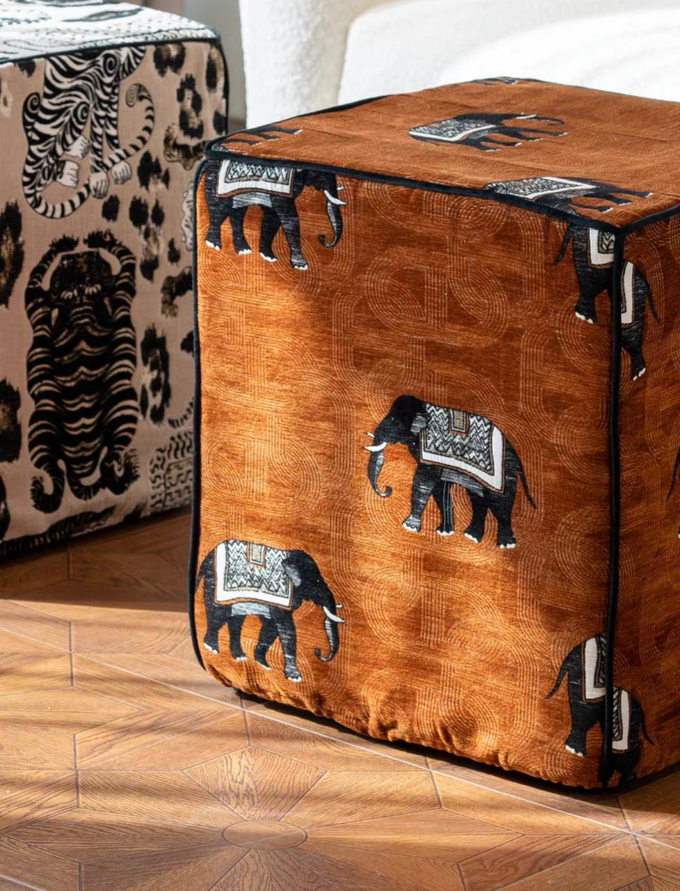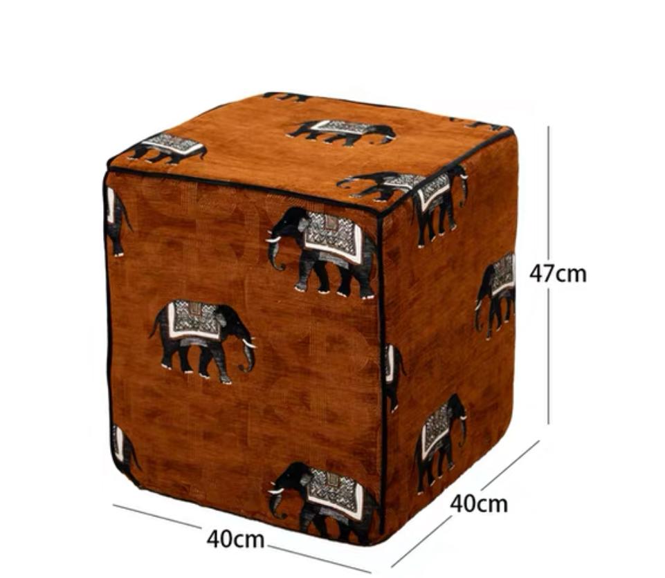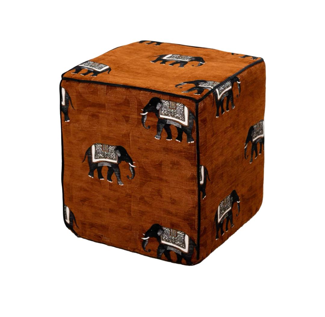 Но самое интересное в этом пуфе – его рисунок. По всему терракотовому фону раскинулась целая процессия слонов! Эти величественные животные, символы мудрости, силы и долголетия, изображены в разных позах и ракурсах. Они могут быть выполнены в контрастных оттенках, например, в бежевом или кремовом, чтобы создать яркий визуальный эффект. Или же они могут быть в более приглушенных тонах, создавая ощущение тонкой ручной работы и художественной ценности.