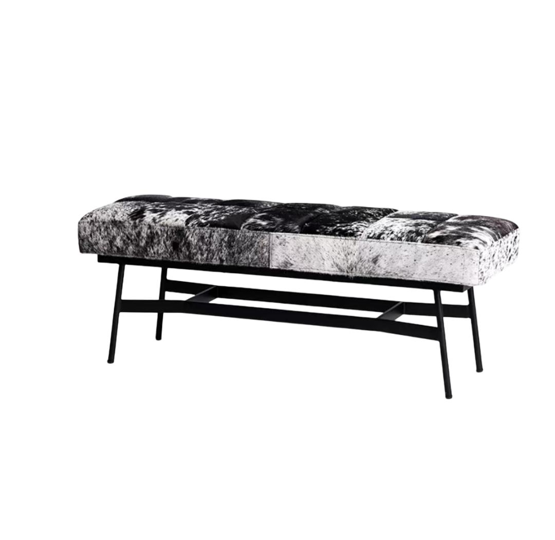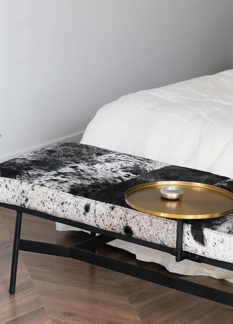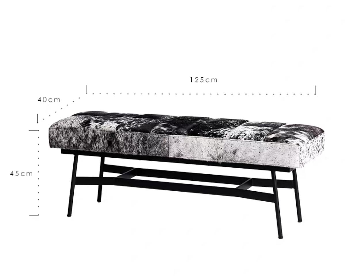 Цвет сиденья – это природный рисунок шкуры коровы, тёмно-серые и чёрные пятна, расположенные в хаотичном порядке. Этот рисунок уникален и неповторим, как отпечаток пальца. Каждый участок кожи имеет свой оттенок и текстуру, что делает сиденье скамьи настоящим произведением искусства. Тёмные пятна создают эффект глубины и объёма, а естественный рисунок шкуры придает скамье аутентичный и рустикальный вид.