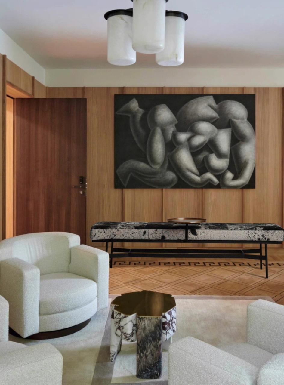 Основание скамьи выполнено из металла – прочного и надежного материала, который обеспечивает устойчивость и долговечность конструкции. Металлический каркас может быть выполнен в виде простых, геометрических форм, подчеркивая минималистичный стиль. Цвет металла обычно тёмный, графитовый или чёрный, чтобы создать контраст с мягким сиденьем и подчеркнуть его природную красоту. Холодный металл придаёт скамье современный, индустриальный вид.