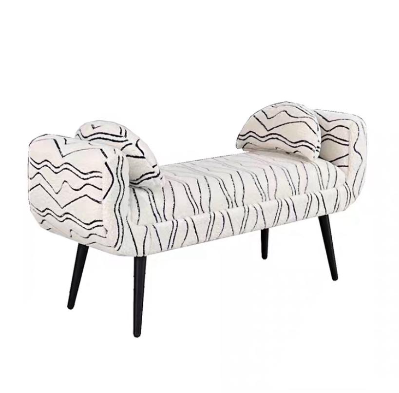 Сиденье и основание скамьи выполнено из мягкой обивки в белом цвете с абстрактными рисунками в стиле этнос.