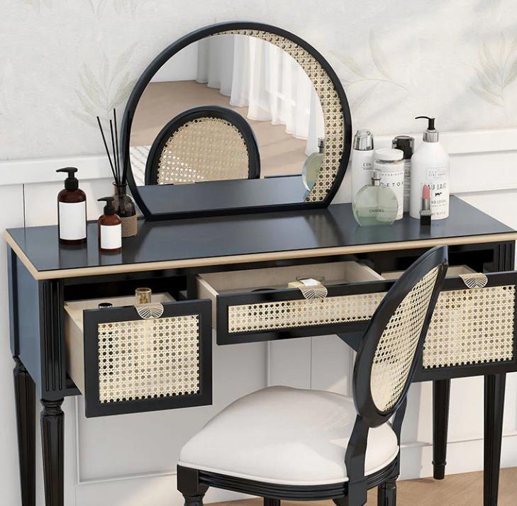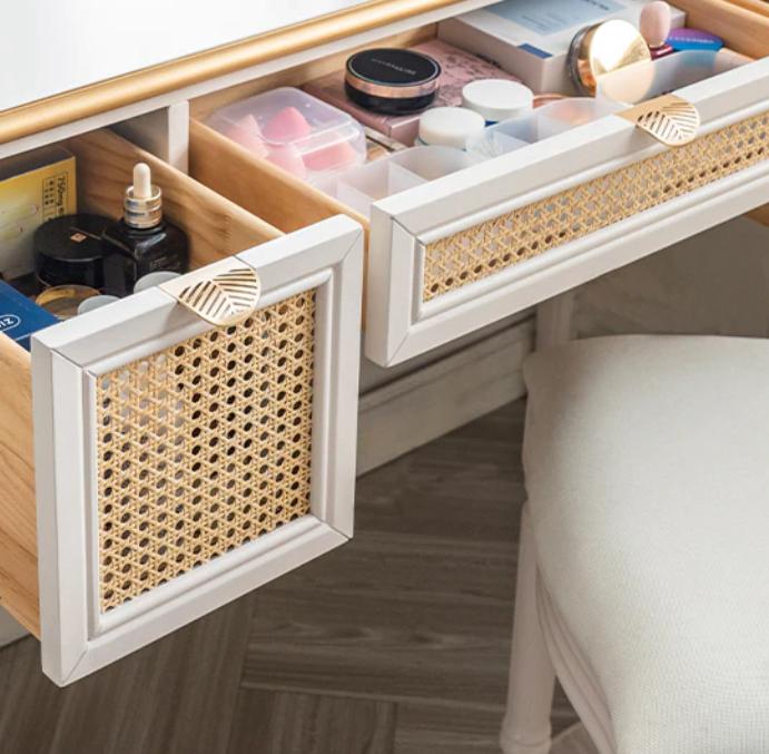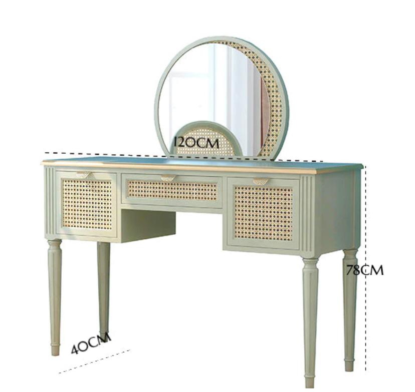 Материал: Материал туалетного столика и стула: массив русской сосны, плетеный вручную индонезийский ротанг. ПУ покрытие на водной основе. Позолоченная ручка