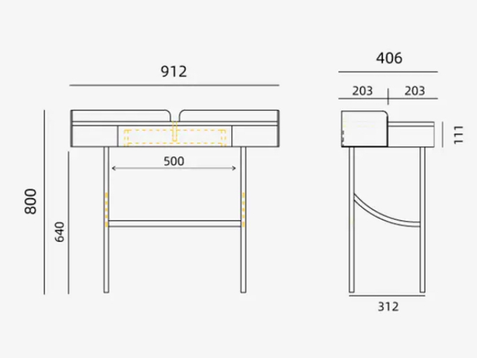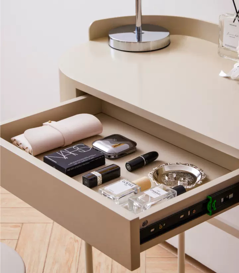 Столик оснащен выдвижным ящиком, который добавляет функциональности и позволяет хранить различные косметические и уходовые средства. Миниатюрный бортик с задней стороны столика дополняет его дизайн и оберегает предметы от падения с поверхности.