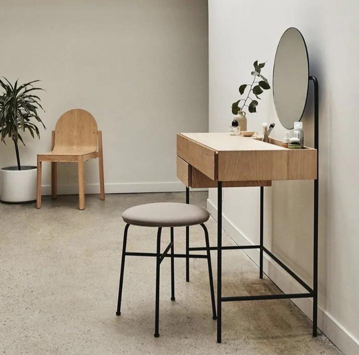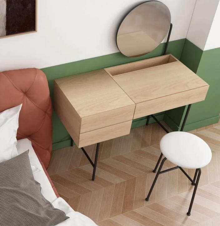 Таким образом, этот простой туалетный столик, выполненный из дуба с ножками из прочной стали, с круглым зеркалом сверху и удобными выдвижными ящиками, отличается своим стильным дизайном, натуральностью и функциональностью. Он будет прекрасным дополнением к любому интерьеру и не похож на предыдущие модели.