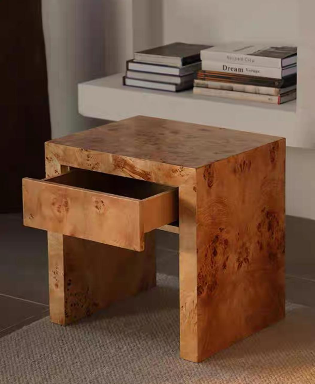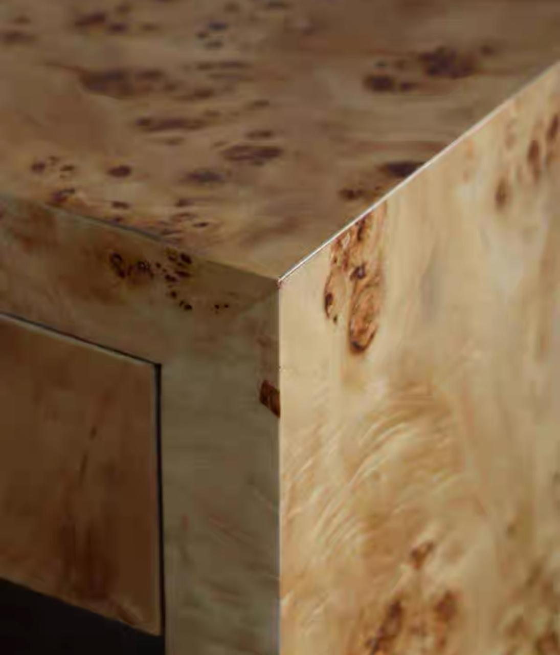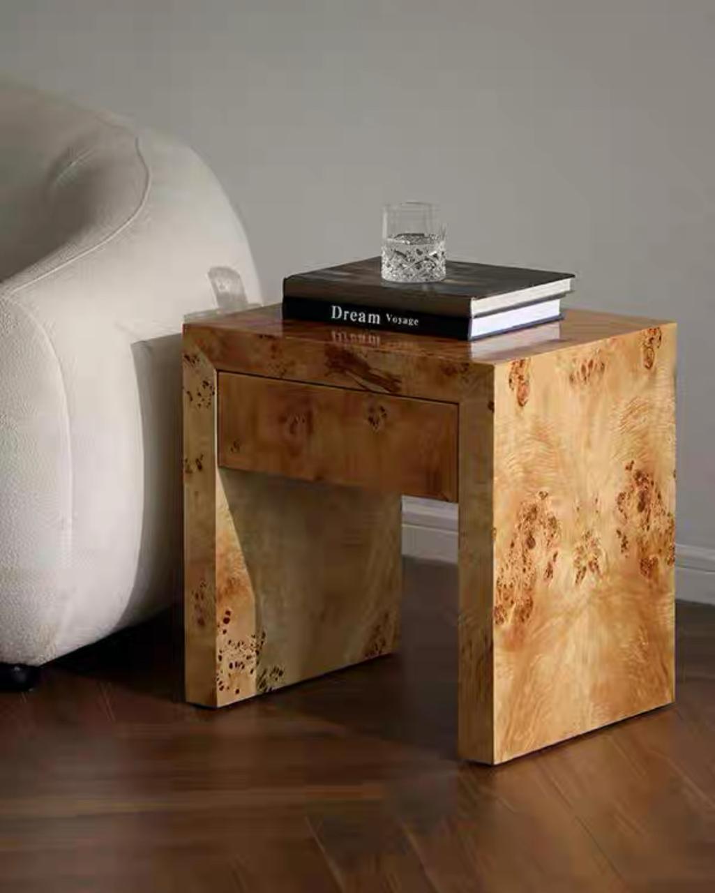 Эта прикроватная тумба излучает тепло и уют, словно согретая лучами солнца. Выполненная из шпона лиственницы, она притягивает взгляд своей естественной красотой и богатой текстурой дерева, напоминающей янтарь. Это не просто функциональный предмет мебели, а элегантное украшение спальни, создающее атмосферу гармонии и спокойствия.