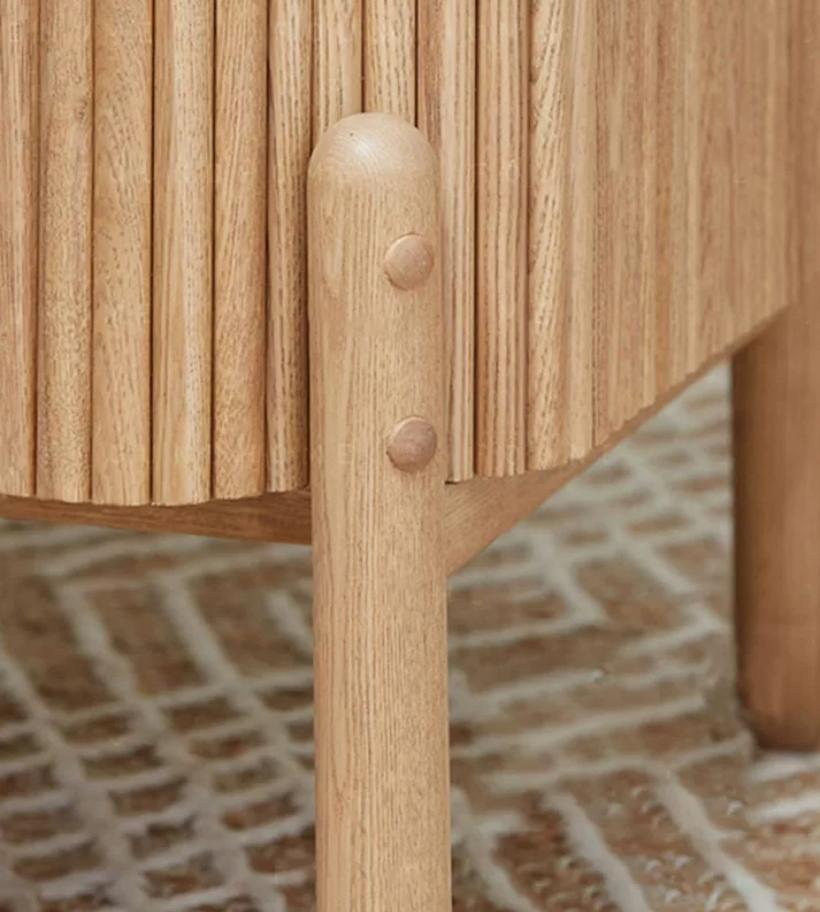 Благодаря своему цвету и дизайну, эта тумбочка легко интегрируется в светлые интерьеры без перегруженности деталями. Она добавляет нотку природной эстетики в комнату благодаря использованию натурального ясеня.