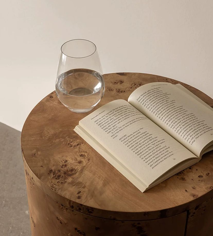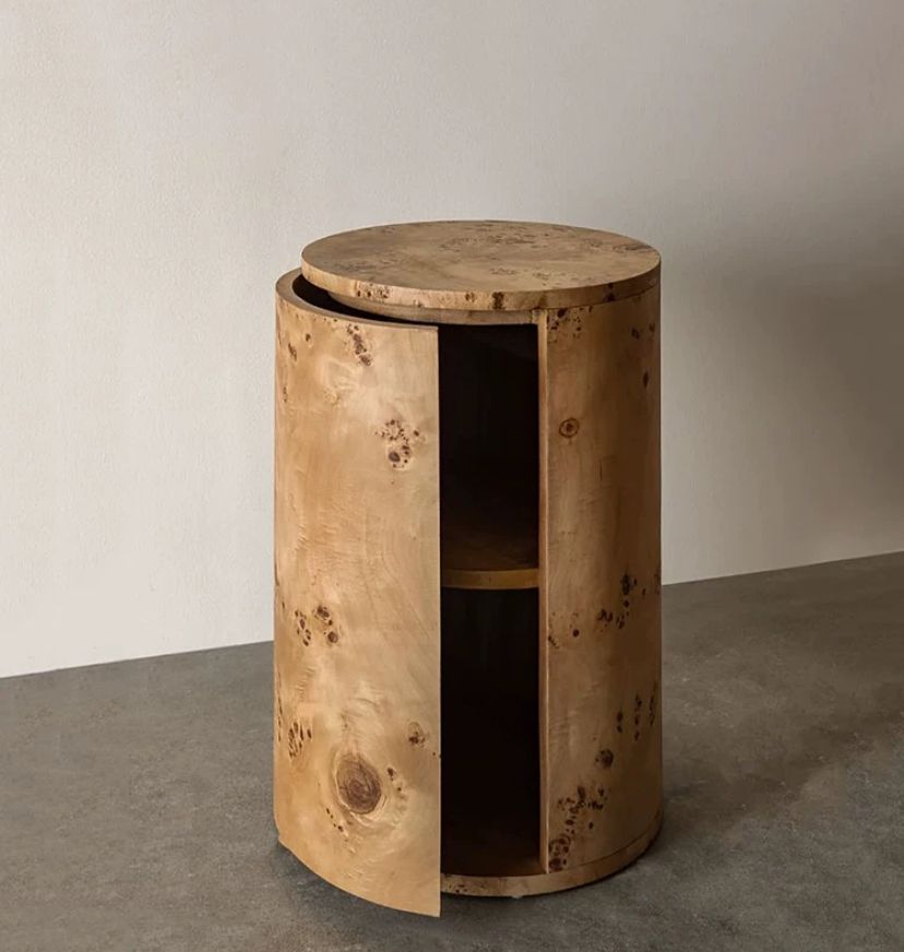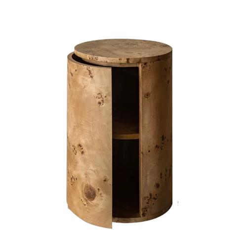 Цилиндрическая форма тумбы придаёт ей необычайную элегантность и уникальность. Отсутствие углов и прямых линий делает её визуально мягкой и дружелюбной, она плавно вписывается в любой интерьер, будь то современный минимализм или уютный эклектичный стиль. Внешний вид тумбы привлекает внимание своей симметрией и тонкой работой мастеров, выполнивших каждую деталь с большой точностью и аккуратностью.