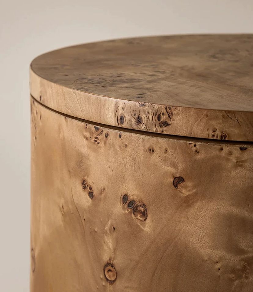 Тумба прикроватная Foresta — представьте себе эту очаровательную и уникальную цилиндрическую тумбу, произведённую из шпона каучукового дерева, материал которого славится своей долговечностью и элегантным внешним видом. Шпон каучукового дерева имеет естественную текстуру, характеризующуюся тонкими, волнистыми линиями и деликатными узорами, которые создаются природой. Эти узоры добавляют золотистому цвету тумбы особенную глубину и богатство, делая её истинным произведением искусства мебели.