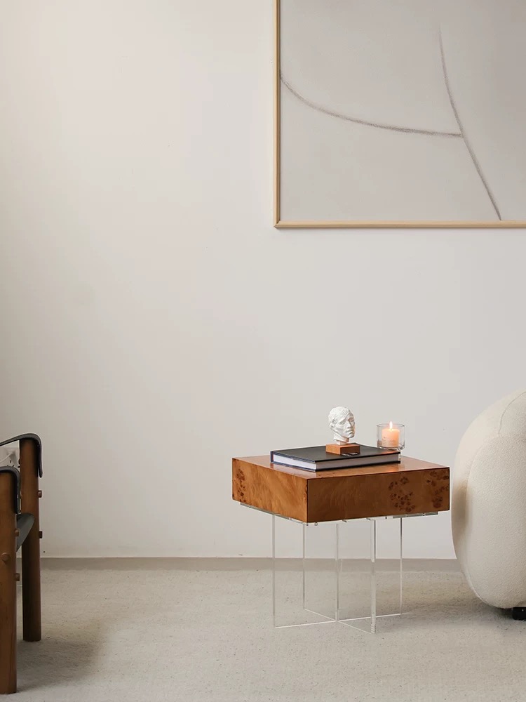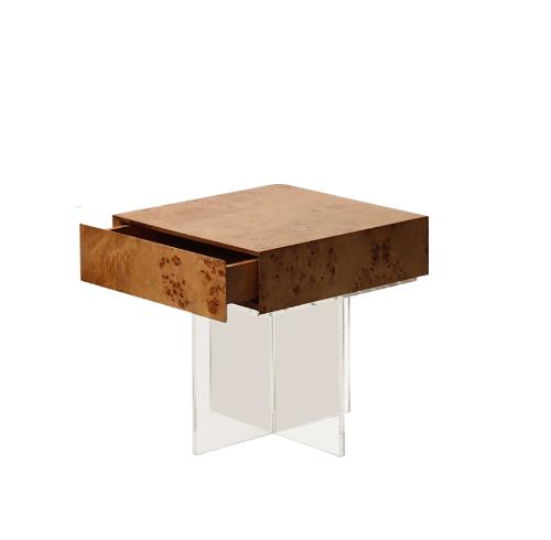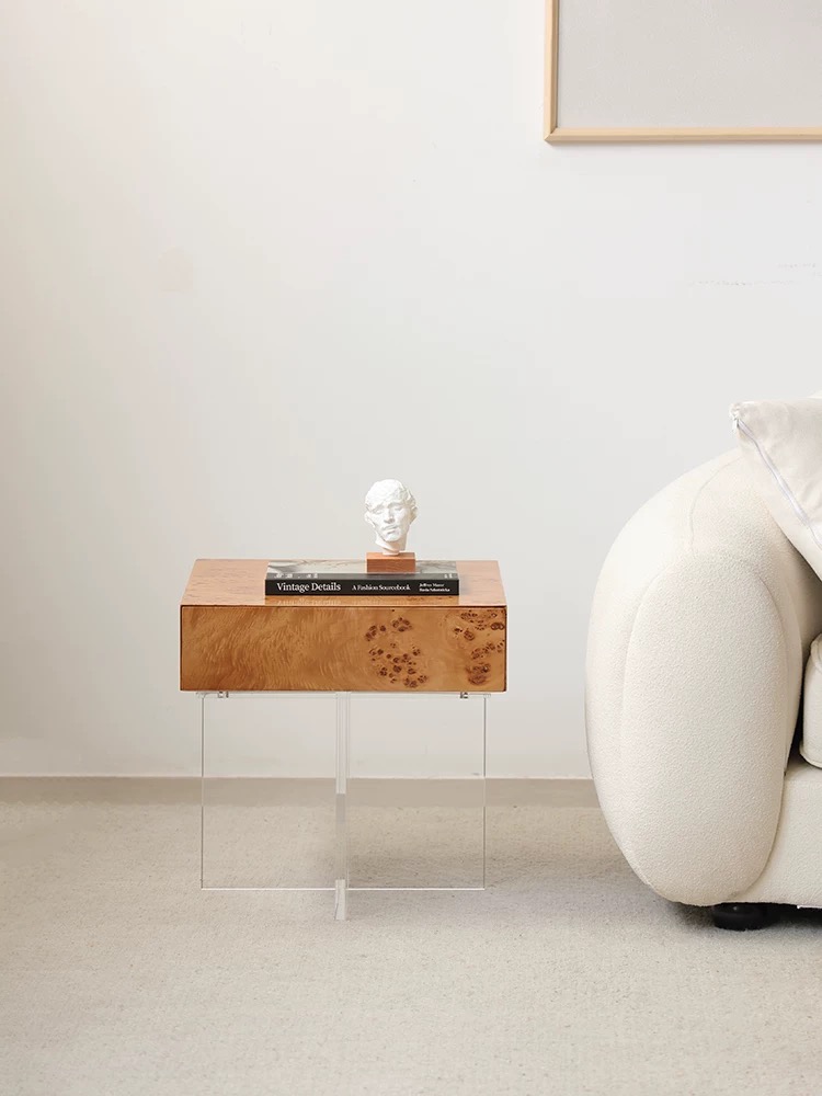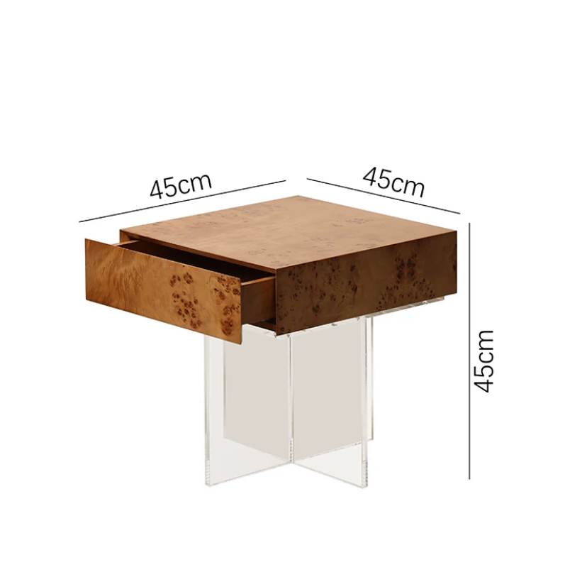 Особое внимание стоит уделить основанию тумбочки, выполненному из прозрачной эпоксидной смолы. Эта деталь добавляет изделию не только оригинальности и современности, но и визуальной легкости, создавая впечатление, что тумбочка парит в воздухе. Прозрачная основа позволяет свету свободно проходить через неё, что может создавать интересные эффекты теней и бликов, добавляя общему дизайну изделия неповторимые акценты.