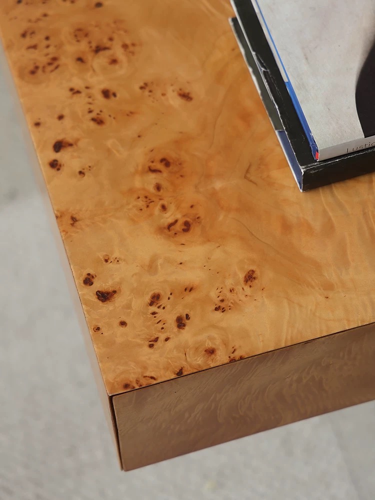 Первое, что бросается в глаза при взгляде на эту тумбочку, — плотная и гладкая текстура древесины, которая подчёркивается хорошо видимыми волокнами и узорами, создающими удивительное многообразие линий и оттенков. Поверхность дерева тщательно обработана и отполирована, что придаёт ей шелковистый блеск и делает её приятной на ощупь. Такой подход к обработке материала не только улучшает эстетическое восприятие тумбы, но и защищает её от износа и повреждений, что особенно важно для мебели, которая используется ежедневно.