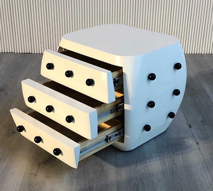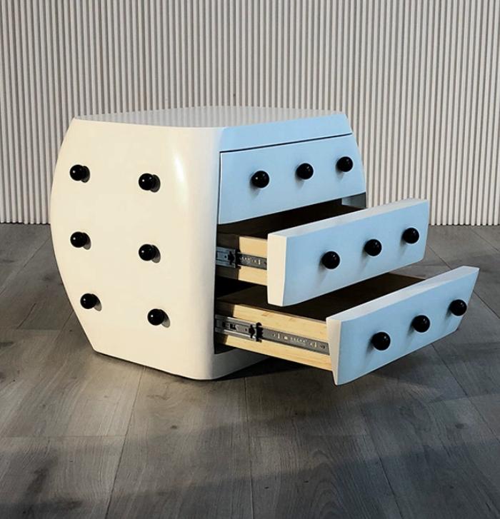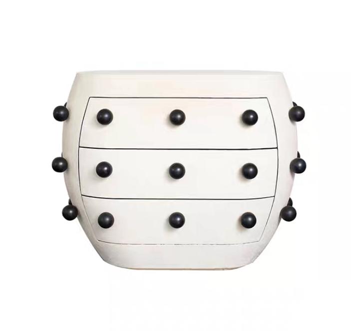 Она имеет три выдвижных ящика, что обеспечивает удобное хранение различных предметов рядом с кроватью. Декоративные черные шарики на фасаде придают этой тумбе особый шарм и уникальный стиль.