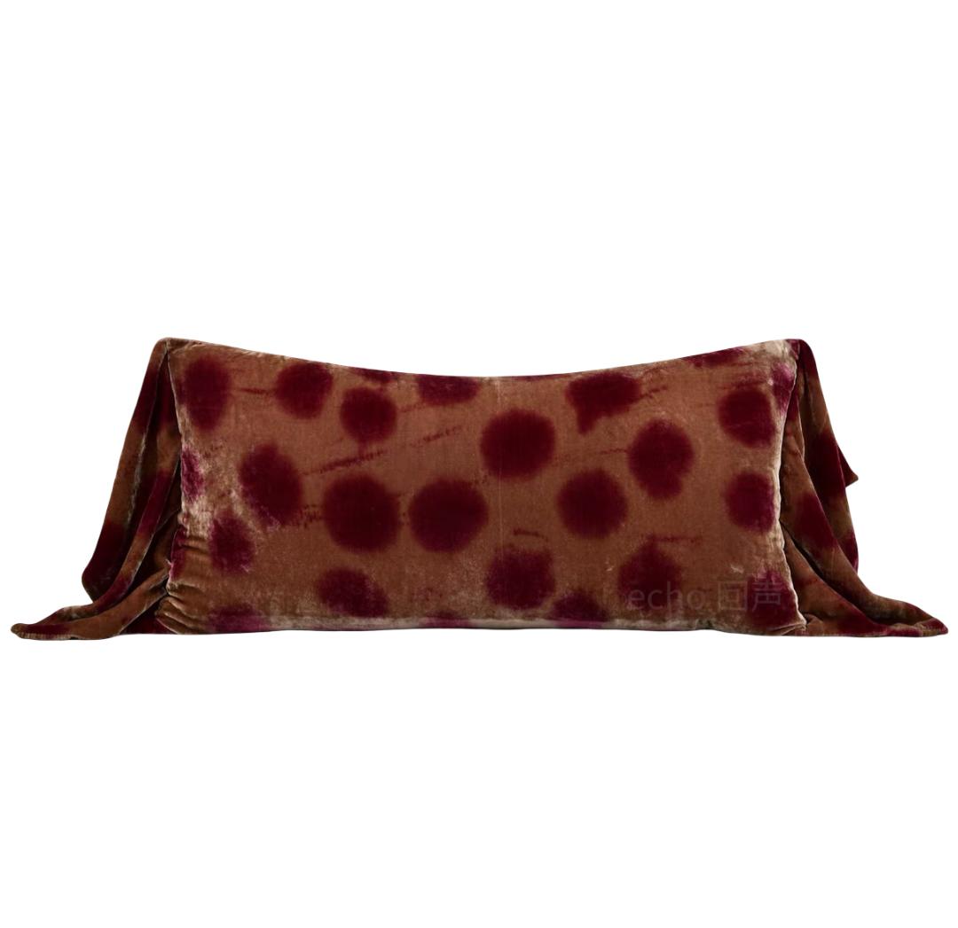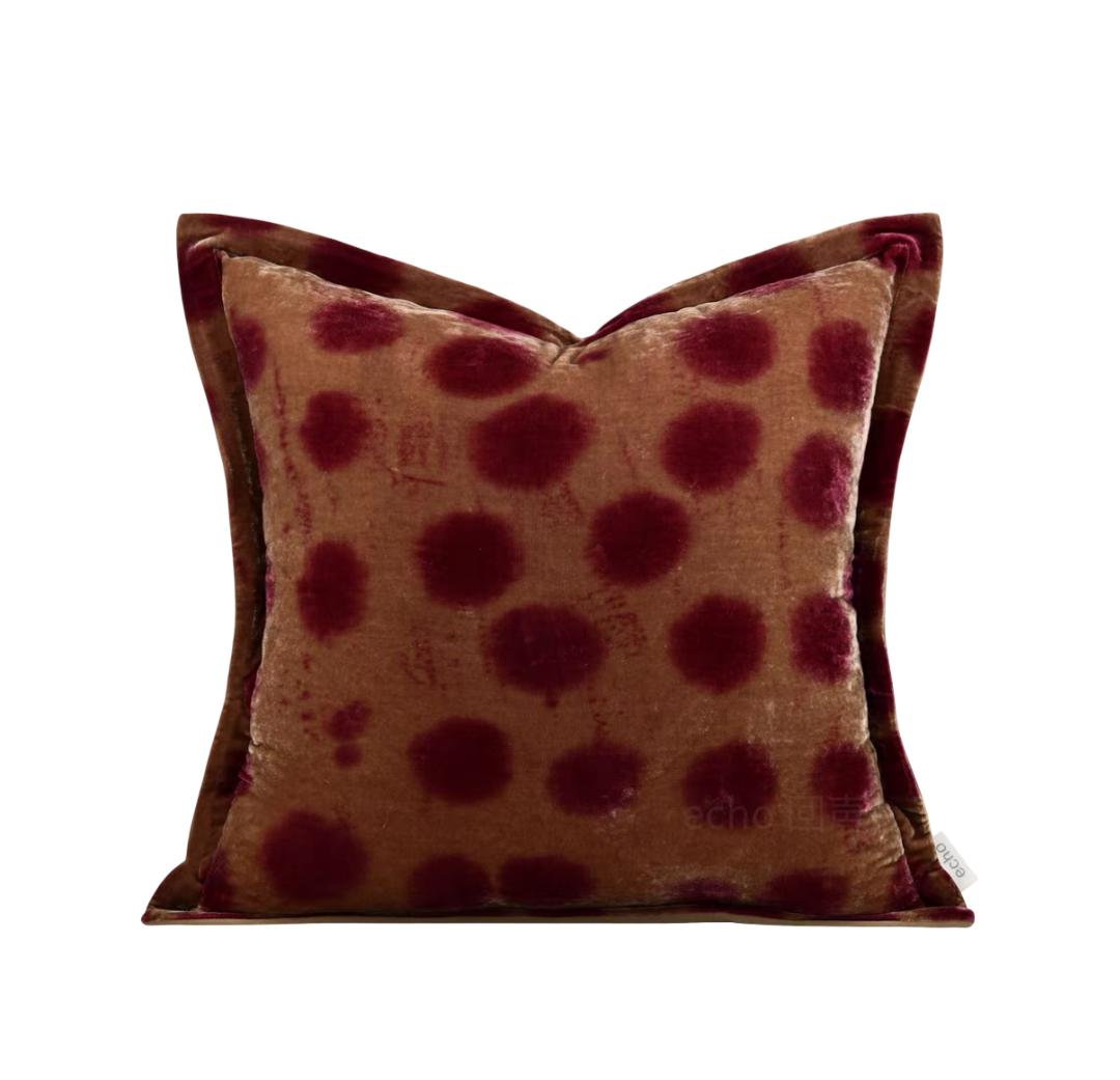 Подарите своему интерьеру лёгкий акцент с такой подушкой: её основа выполнена из мягкой, бархатистой ткани глубокого кирпичного оттенка, который напоминает тёплую и слегка огненно‑красную глину старинных стен. На этой насыщенной фоне всплывают крупные пятна‑горохи более тёмного, почти бордового цвета, создавая выразительный контраст и добавляя чуть игривую нотку в строгую палитру.