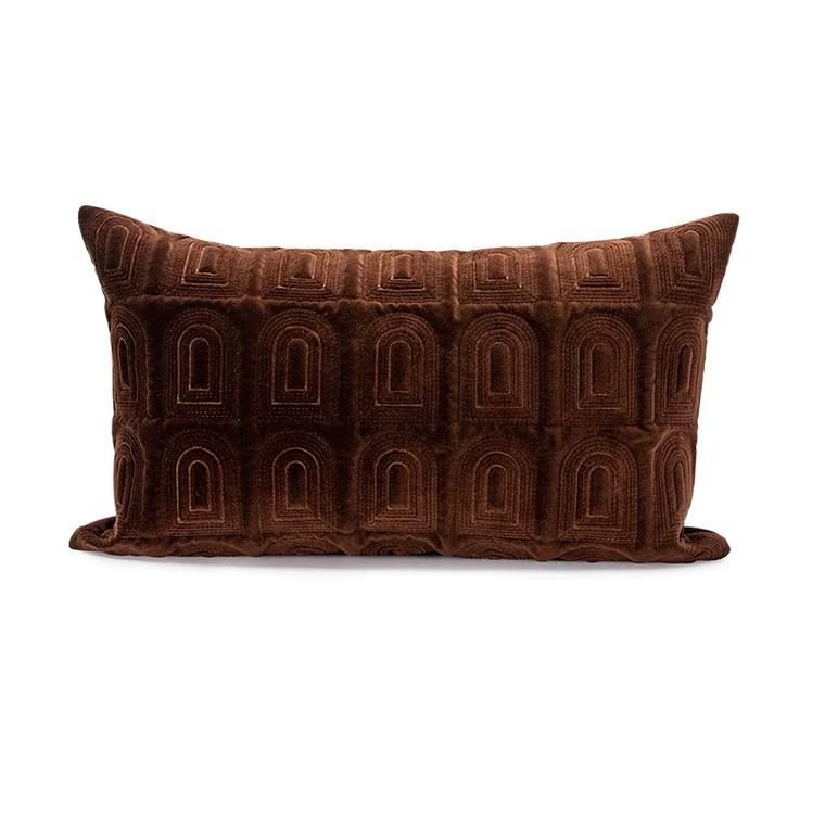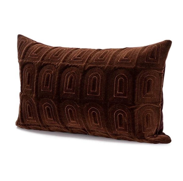 Декоративная подушка в форме прямоугольника, размером 50*30 см, с чехлом из мягкого коричневого велюра, вышитыми узорами в виде окошек в замке и наполнителем из микрофибры — это безусловно тот уникальный элемент, который сделает любой интерьер еще более изящным и привлекательным. У нее есть способность преобразить любое помещение, придав ему неповторимый колорит и стиль.