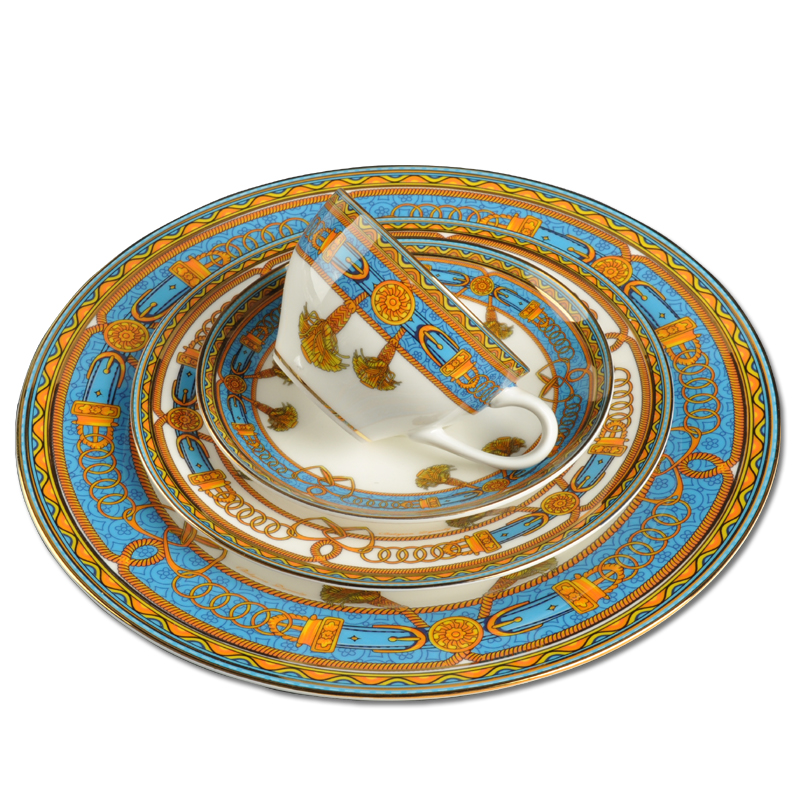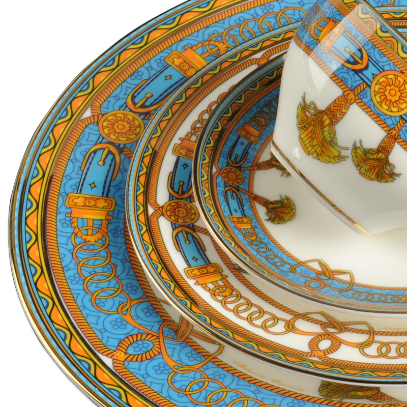 Роскошный комплект дополнит образ изысканного интерьера вашей кухни. Этот набор состоит из четырех предметов: большой тарелки, малой тарелки , чашки и блюдца. Невозможно быть истинным ценителем моды и при этом не обладать ни одной вещью HERMES. Пусть на этот раз это будет роскошная посуда в фирменных цветах этого известного дома моды!