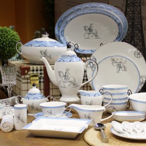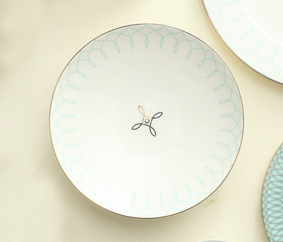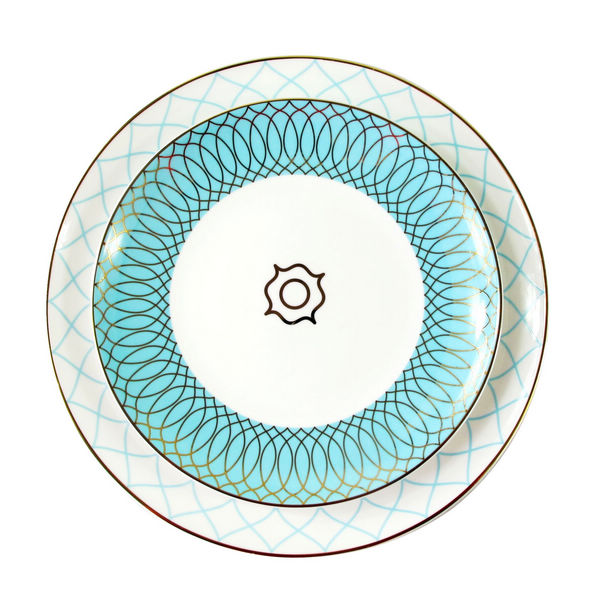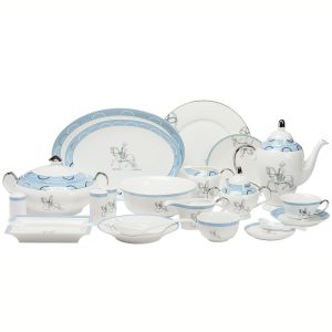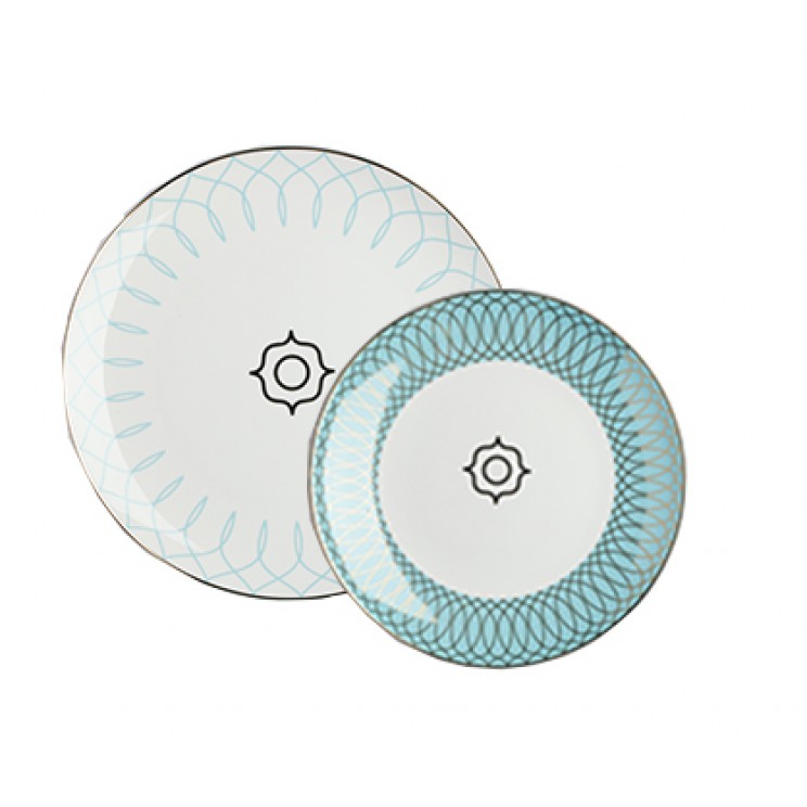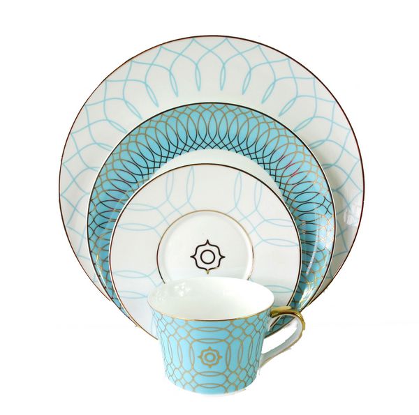 Этот обольстительный и стильный обеденный комплект из тончайшего костяного фарфора придаст роскоши и элегантности интерьеру вашей кухни. Нежно-голубые узоры этих роскошных тарелок и чайной пары выгодно перекликаются с яркими золотыми деталями, что ни есть произведение искусства!