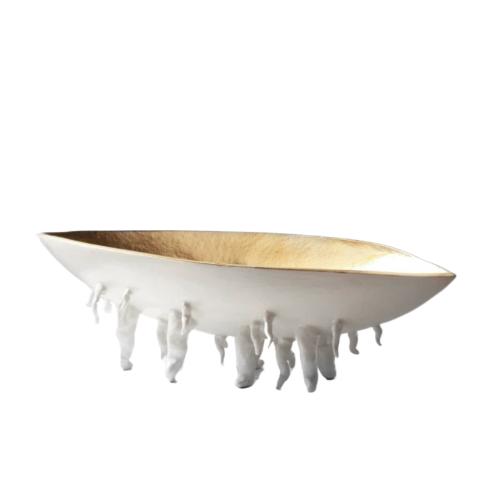 Эта космическая работа сливает воедино контрасты и противоположности — матовую и металлическую текстуры, абстракцию и естественные формы, хрупкость керамики и прочность идеи. Каждая часть этого блюда, от его светло-матовой внешности до переливающейся металлической внутренности, от основания из сталактитовых палочек до впечатляющей формы и стиля — это выражение не только мастерства, но и глубокого космического вдохновения.