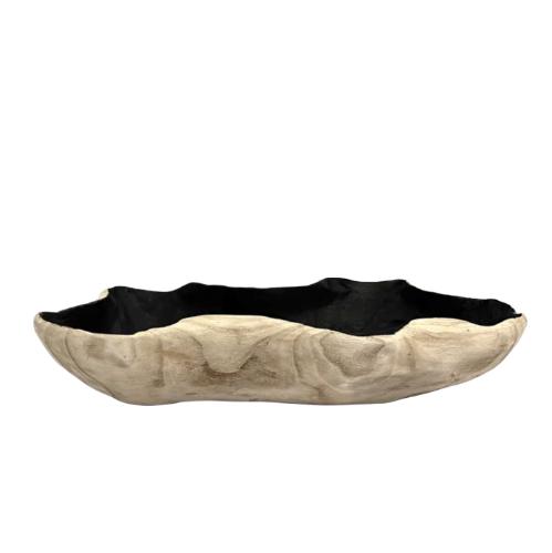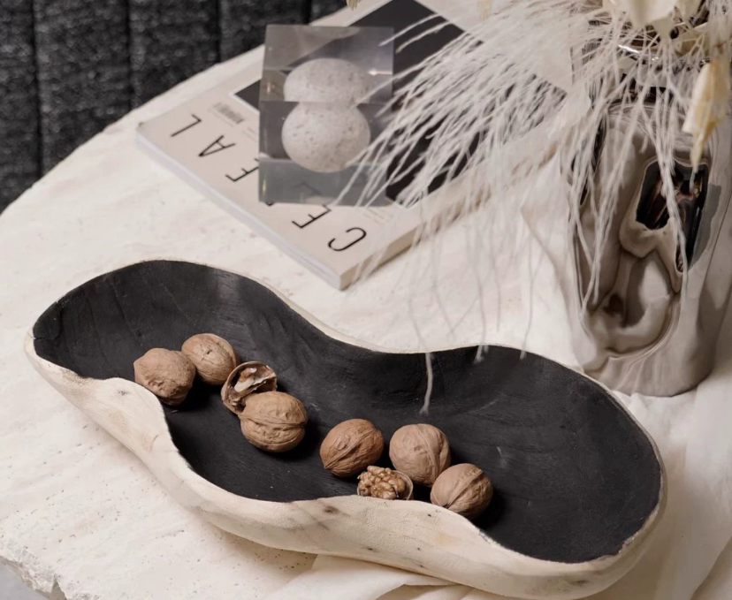 Поверхность внутри блюда отполирована и искусно затемнена, что придаёт ему дополнительную глубину и контраст. Этот тёмный оттенок подчеркивает светлую верхнюю поверхность, оставленную мастером практически без изменений, словно бы отдать дань уважения её природному рисунку. Каждая линия, каждая трещинка и завиток — это история, рассказанная древесиной, история, которая началась задолго до того, как это дерево было взято для создания шедевра.