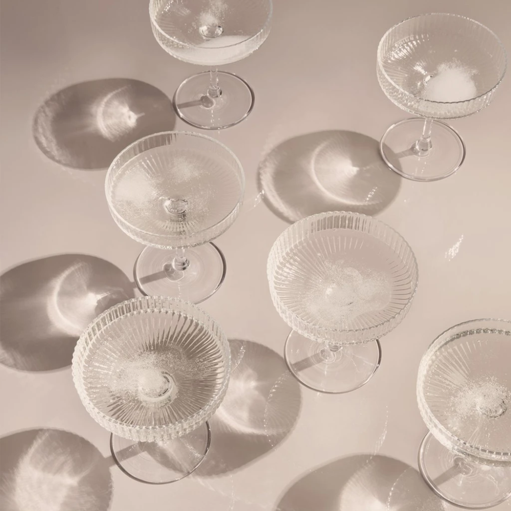 Изумительной красоты винтажное граненное стекло, делают этот бокал неотъемлемой частью любого застолья модного дома , естественно! У этого бокала широкая и мелкая чаша, и это самый старый из всех бокалов для шампанского, популярный в начале 20 века. Прижившись в качестве образа классического люкса, бокал Ripple ассоциируется с определёнными эпохами и нарочитой роскошью: вечеринками в стиле Великого Гэтсби, «Подпольной Империи» или бомонда 60х, когда шампанские «блюдца» тоже были в моде.