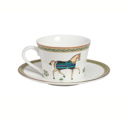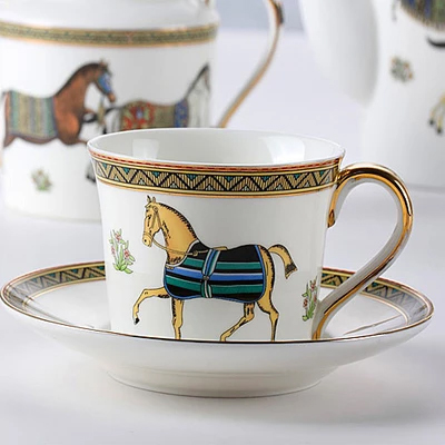 Роскошный комплект из блюдца и чашки, выполненный из тончайшего фарфора, дополнит образ изысканного интерьера вашей кухни. А его изысканные узоры и изображение лошадки принесут в ваш дом настроение праздника!