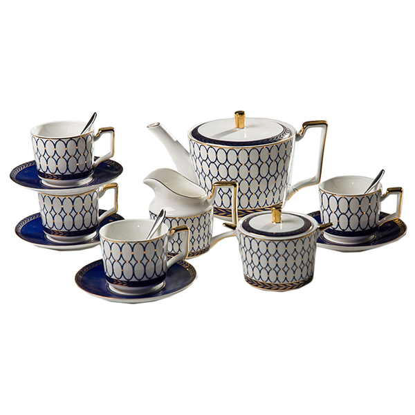 В комплект входит 11 предметов: чайник, молочник, сахарница, четыре кружки, четыре блюдца.