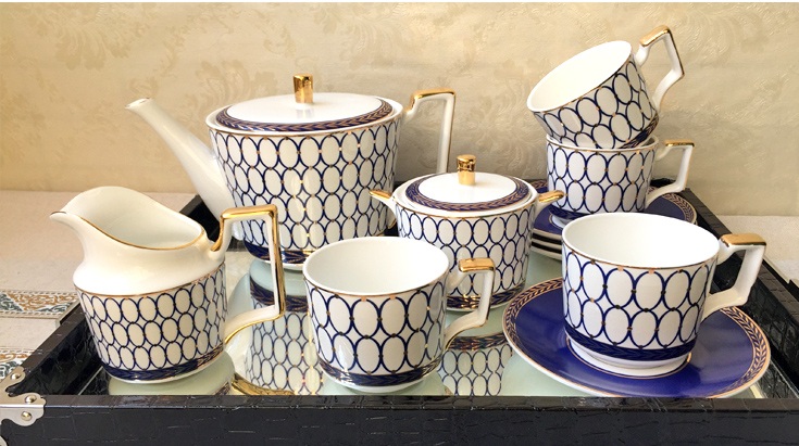 В комплект входит 11 предметов: чайник, молочник, сахарница, четыре кружки, четыре блюдца.