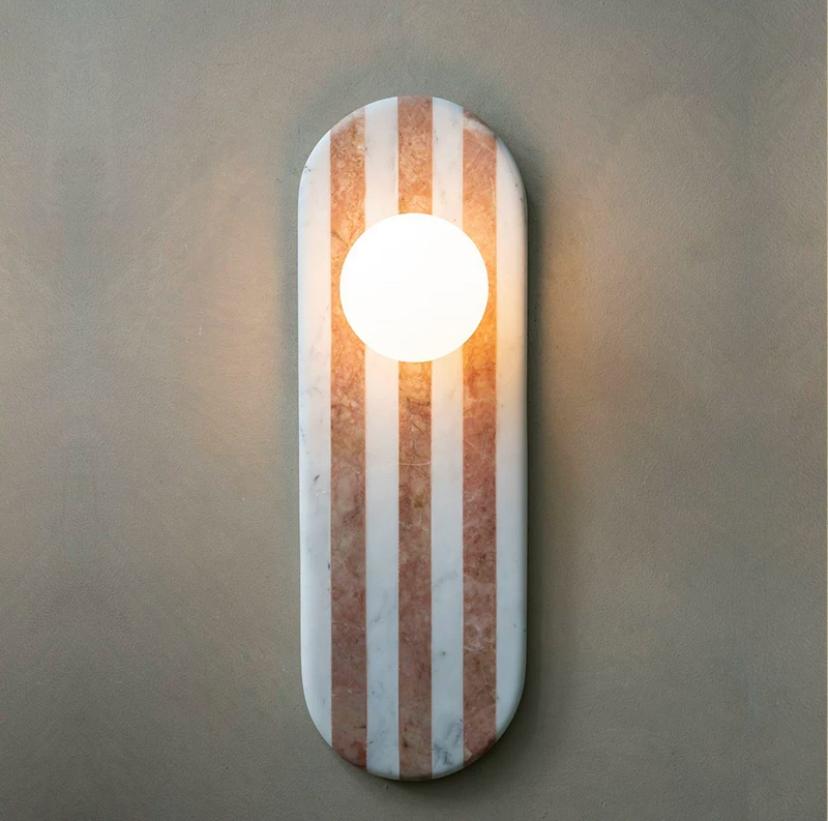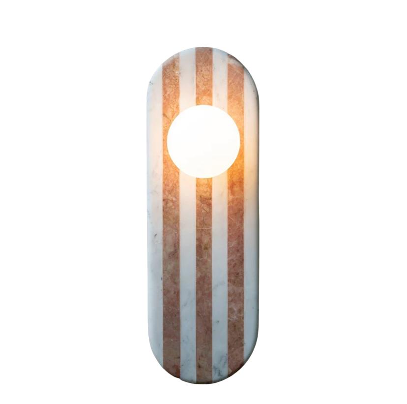 На поверхности камня видны широкие вертикальные полоски, окрашенные в нежный абрикосовый цвет. Эта комбинация цвета и текстуры создает элегантный и современный вид светильника, который привлекает внимание и становится украшением для любого интерьера.