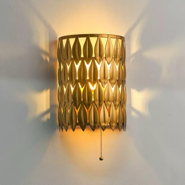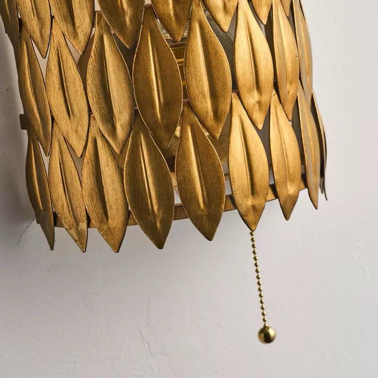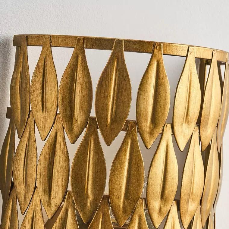Настенный светильник Bohems в форме полукруга цилиндра с металлическими лепестками в виде лавровых листьев в золотистом состаренном цвете является источником элегантного и стильного освещения. Он отлично сочетается с различными интерьерами и добавляет особый шарм и теплоту в ваш дом.